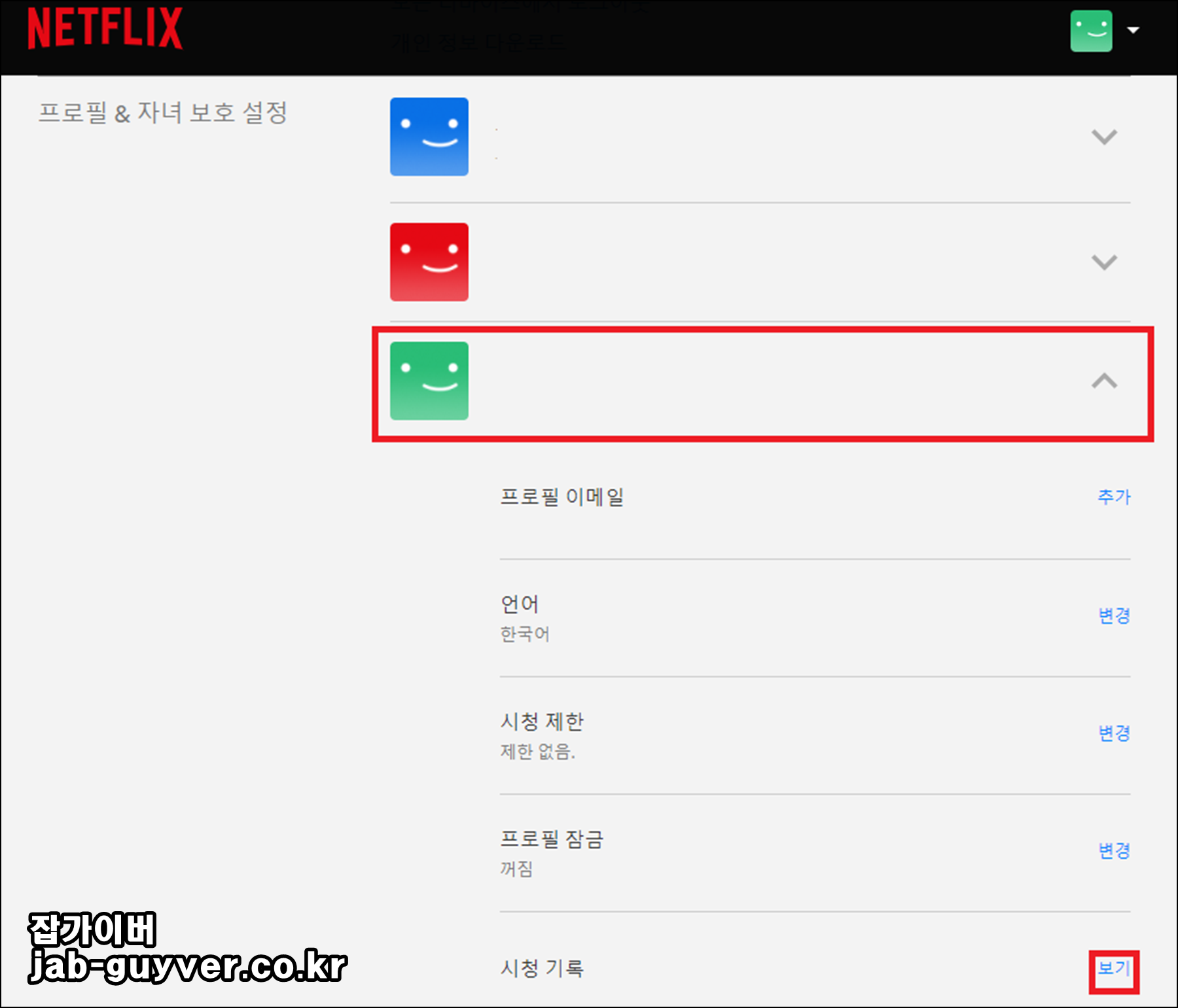 그럼 현재 자신으 ㅣ넷플릭스 계정을 확인하고 프로필 이메일과 언어,시청제한,프로필잠금,시청기록등을 변경하거나 볼 수 있습니다.