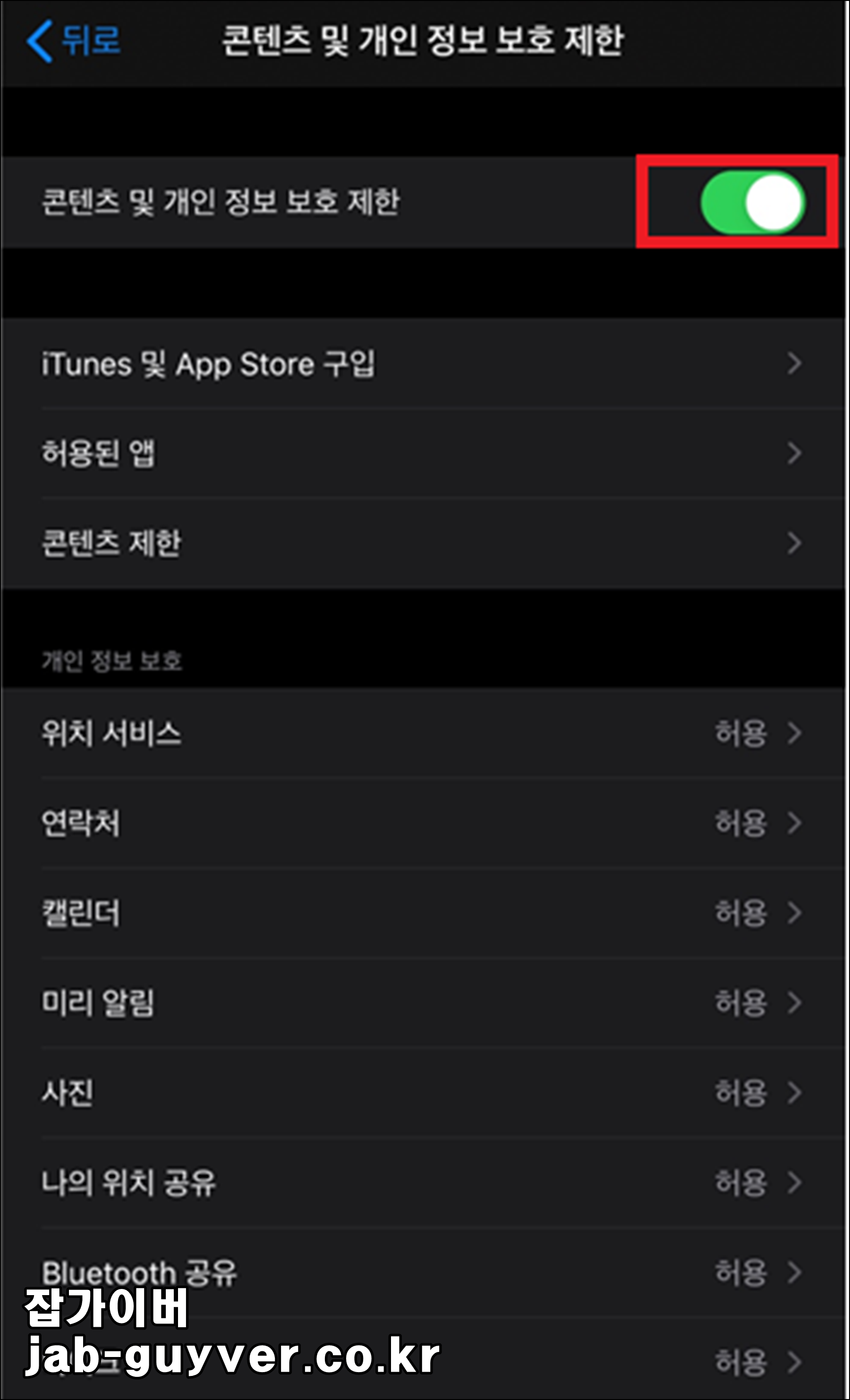 콘텐츠 및 개인정보 보호 설정을 활성화합니다.