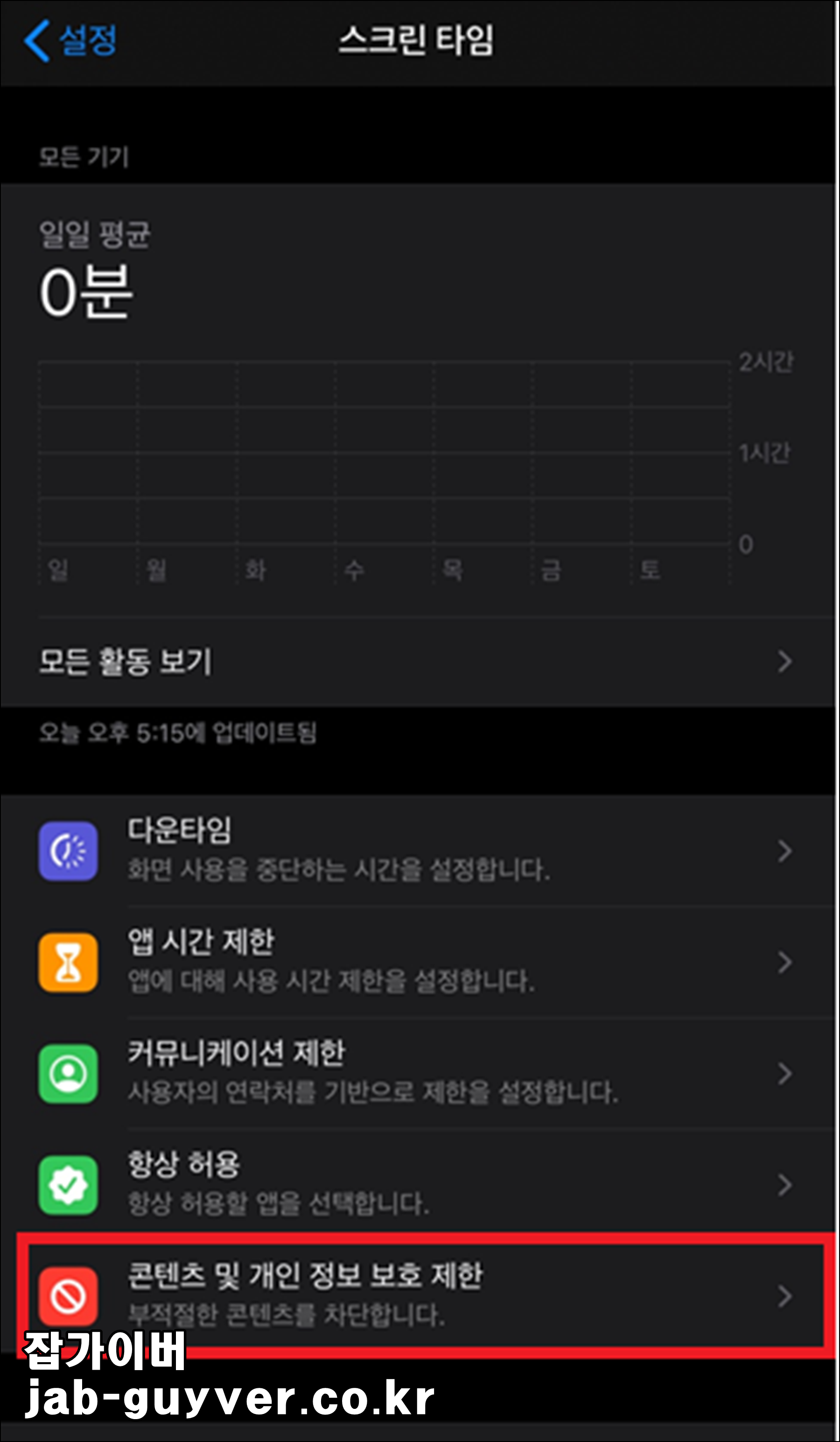 아이폰 설정 -> 스크린타임을 선택합니다.