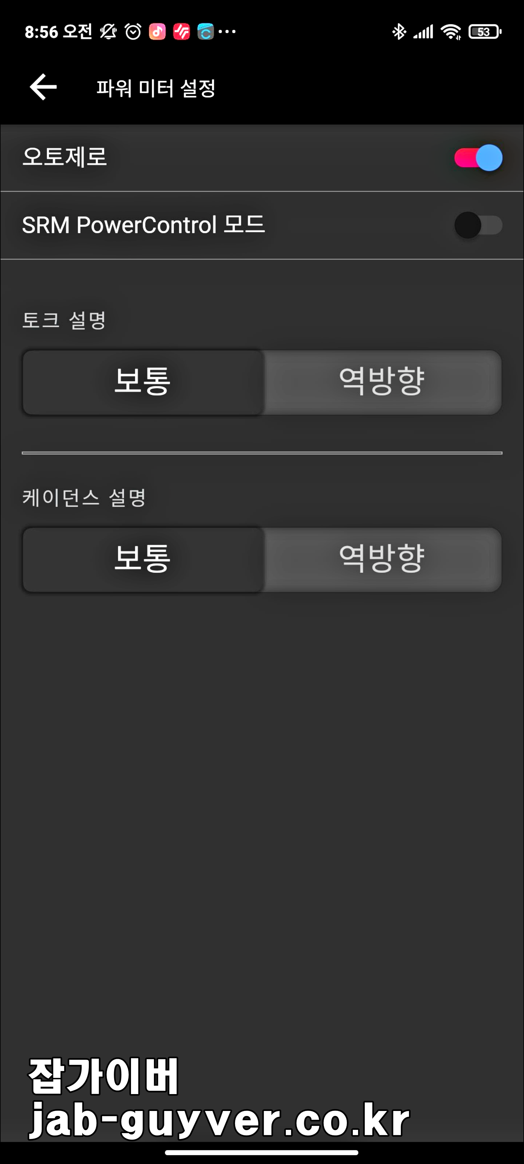 그리고 파워미터 자체에 달려있는 케이던스와 토크 설정을 일반적으로 회전하는 순방향외 역방향으로도 설정이 가능합니다.