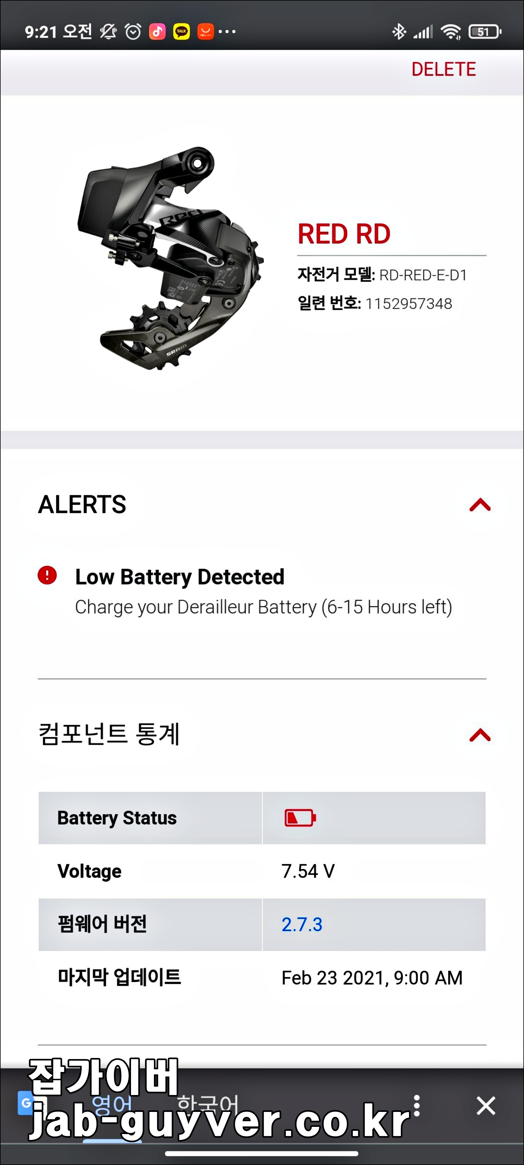 스마트폰의 SRAM AXS 앱을 연동해두면 페어링된 컴퍼넌트의 배터리 상태를 한 화면에서 확인할 수 있습니다.