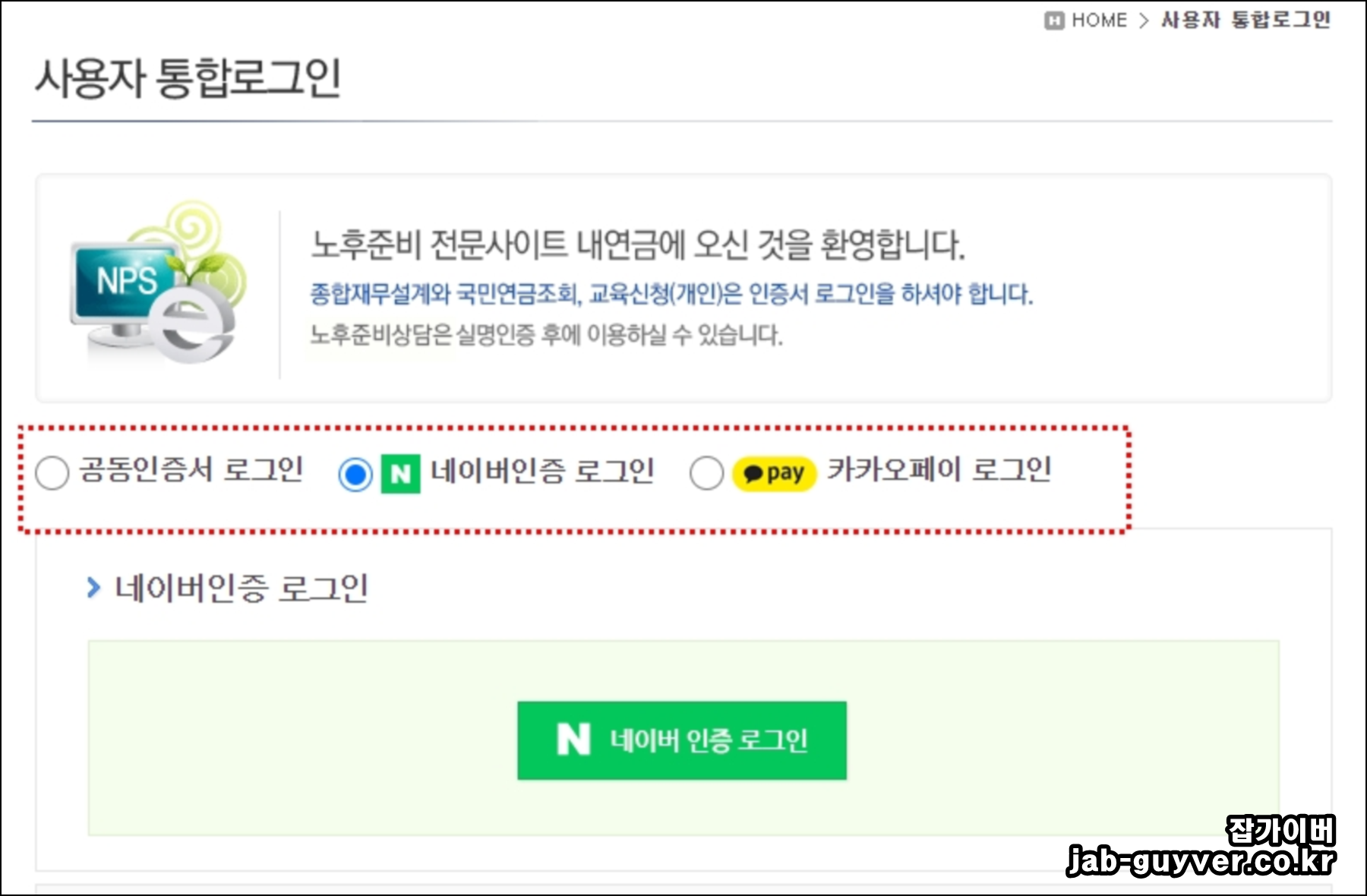 - 예상연금액 조회 서비스를 이용하여, 간편인증 또는 공인인증으로 로그인합니다.