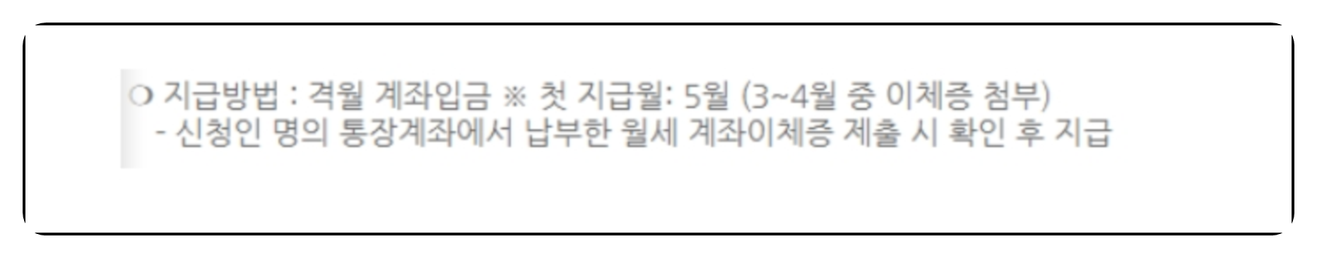 신청인 명의 통장 계좌에서 납부한 월세 계좌이체증 제출 시 확인 후 지급됩니다.