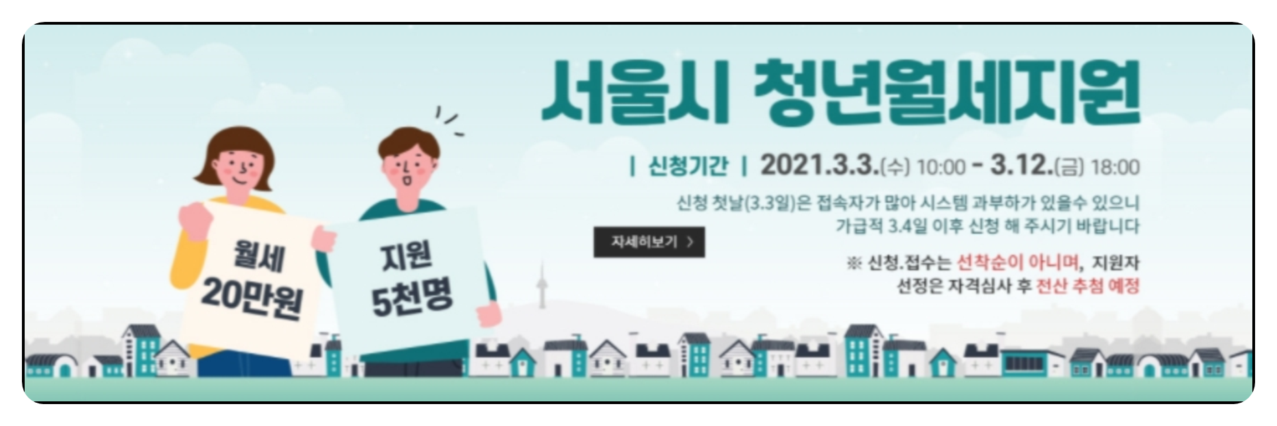 서울에서 자취하고 있는 청년들을 위해 서울시에서는 2021년 3월 3일부터 청년월세지원 정책을 실시했습니다. 이는 점점 오르는 부동산으로 인해 부담을 느끼는 청년들을 위해 서울에서 혼자 살