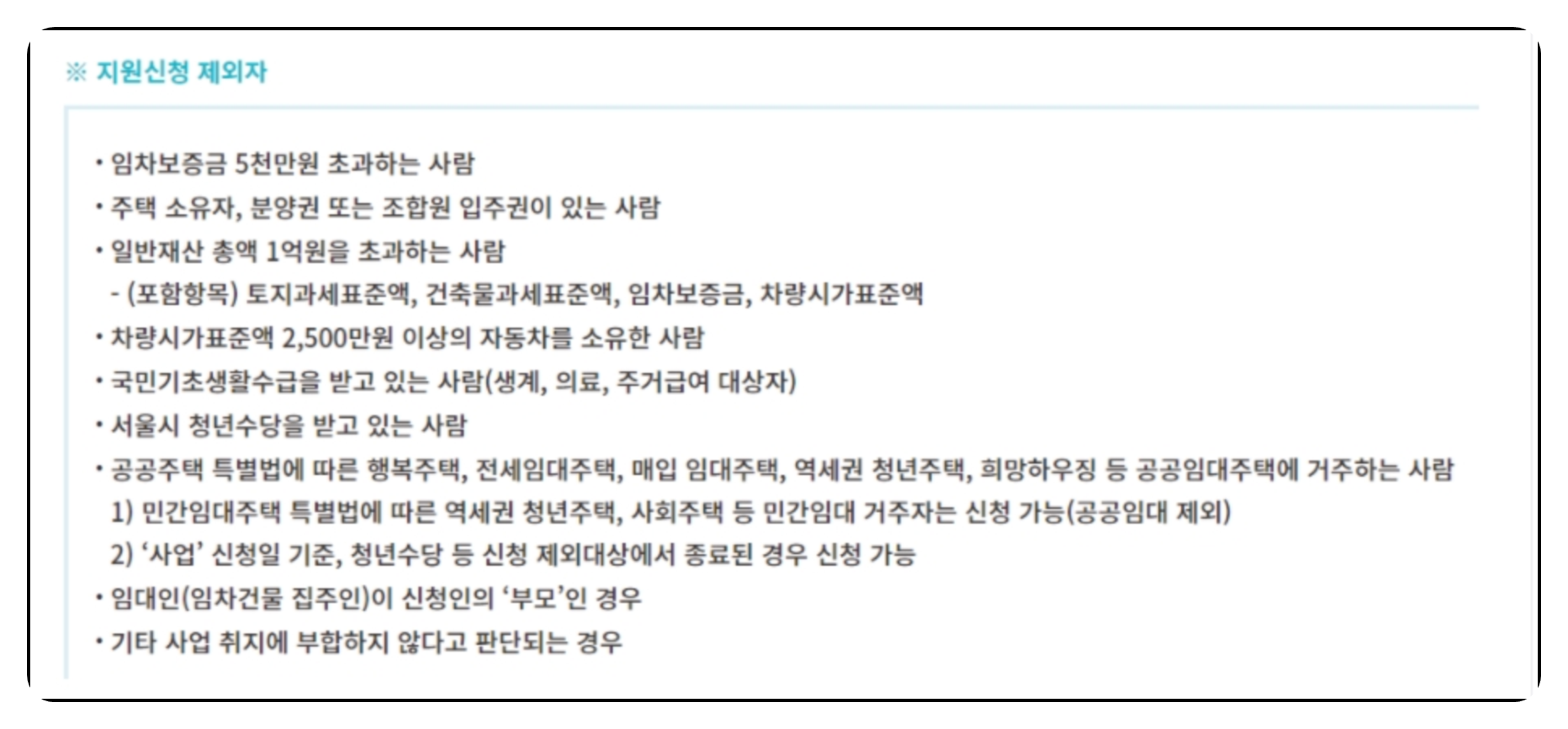 - 민간임대주택 특별법에 따른 청년 주택, 사회주택 등 민감임대 거주자는 신청이 가능하나 공공임대는 제외됩니다.