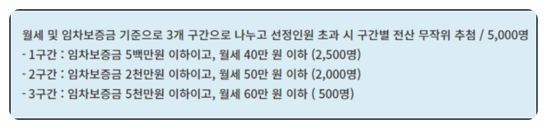 지원 대상은 신청일 기준으로 서울시에 거주지를 두고 있고, 만 19~39세의 1인 가구 청년에 대하여 1구간 2구간 3구간으로 총 5천명을 대상으로 무작위로 추첨하기 때문에 선착순으로 빨리 지원할 필요가 없습니다.