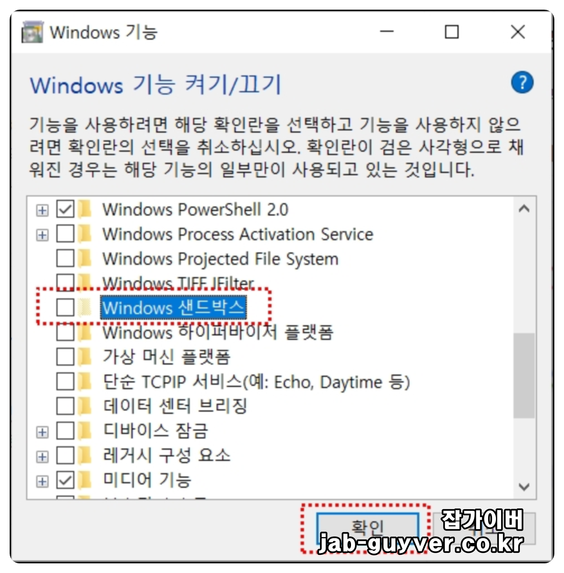 Windows 기능 켜기/끄기를 통해 Windows 샌드박스를 체크하고 확인을 눌러주면 설치가 진행됩니다.