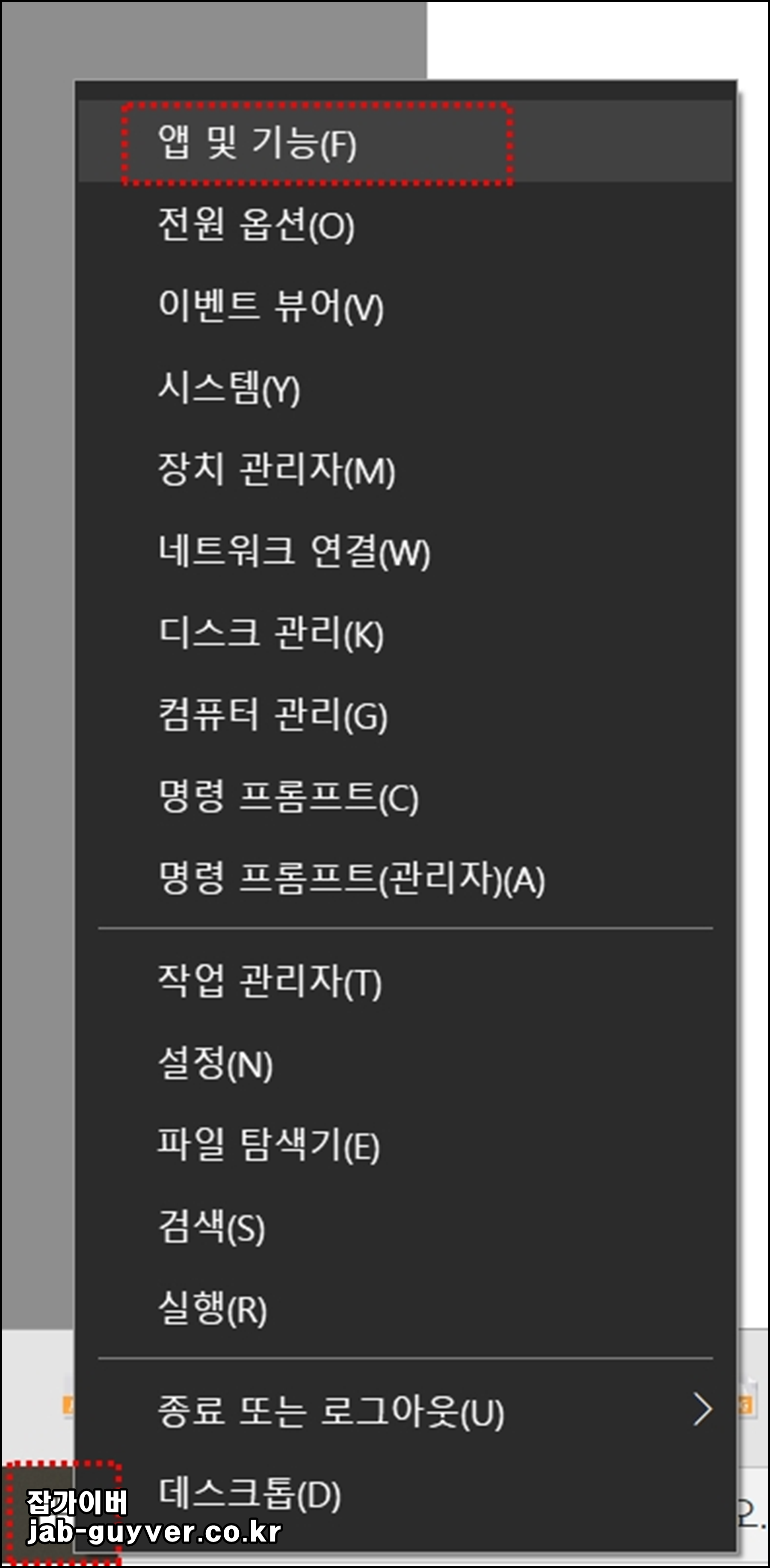 윈도우 로고 마우스 우클릭 "앱 및 기능"선택합니다.