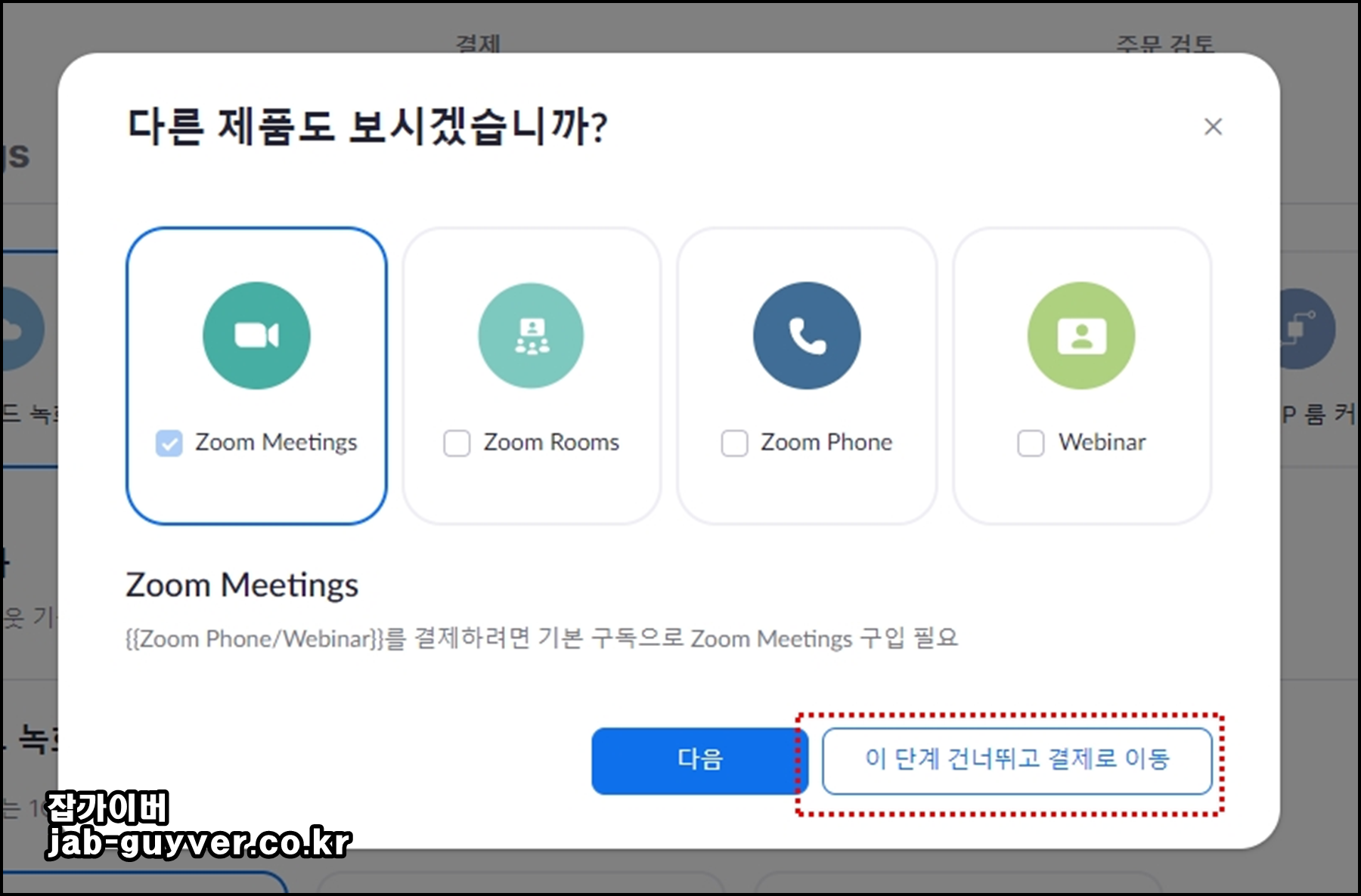 결제시 추가로 줌 미팅과 줌 룸,줌 폰,웨비나등의 패키지를 추천하며 필요 없다면 이 단계 건너뛰고 결제로 이동을 선택합니다.