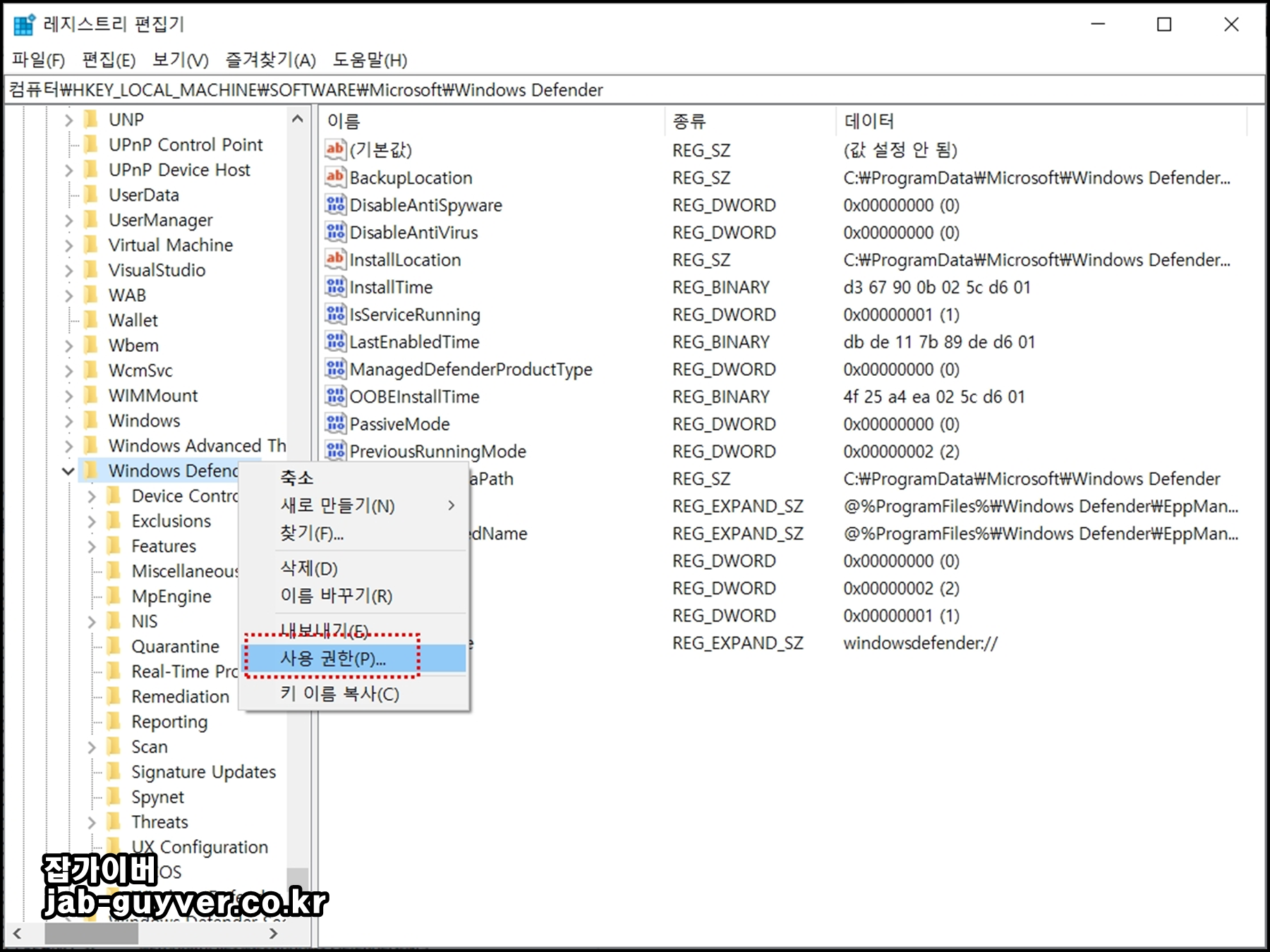 레지스터리 편집기를 통해 Windows Denfender의 사용권한을 부여합니다.