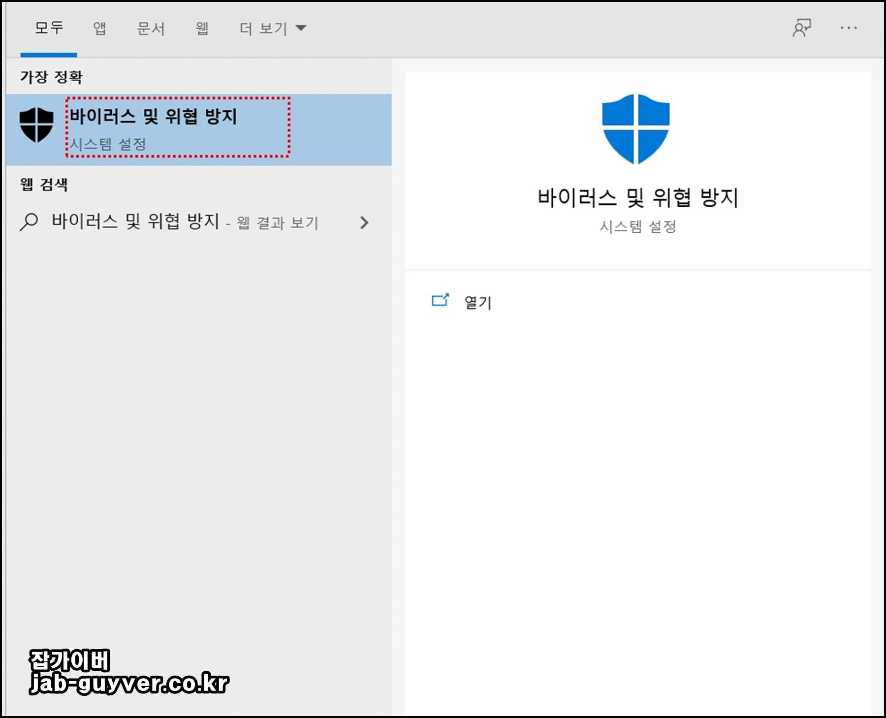 우선 최신버전으로 윈도우10 업데이트를 진행 후 바이러스 및 위혐방지를 실행합니다.