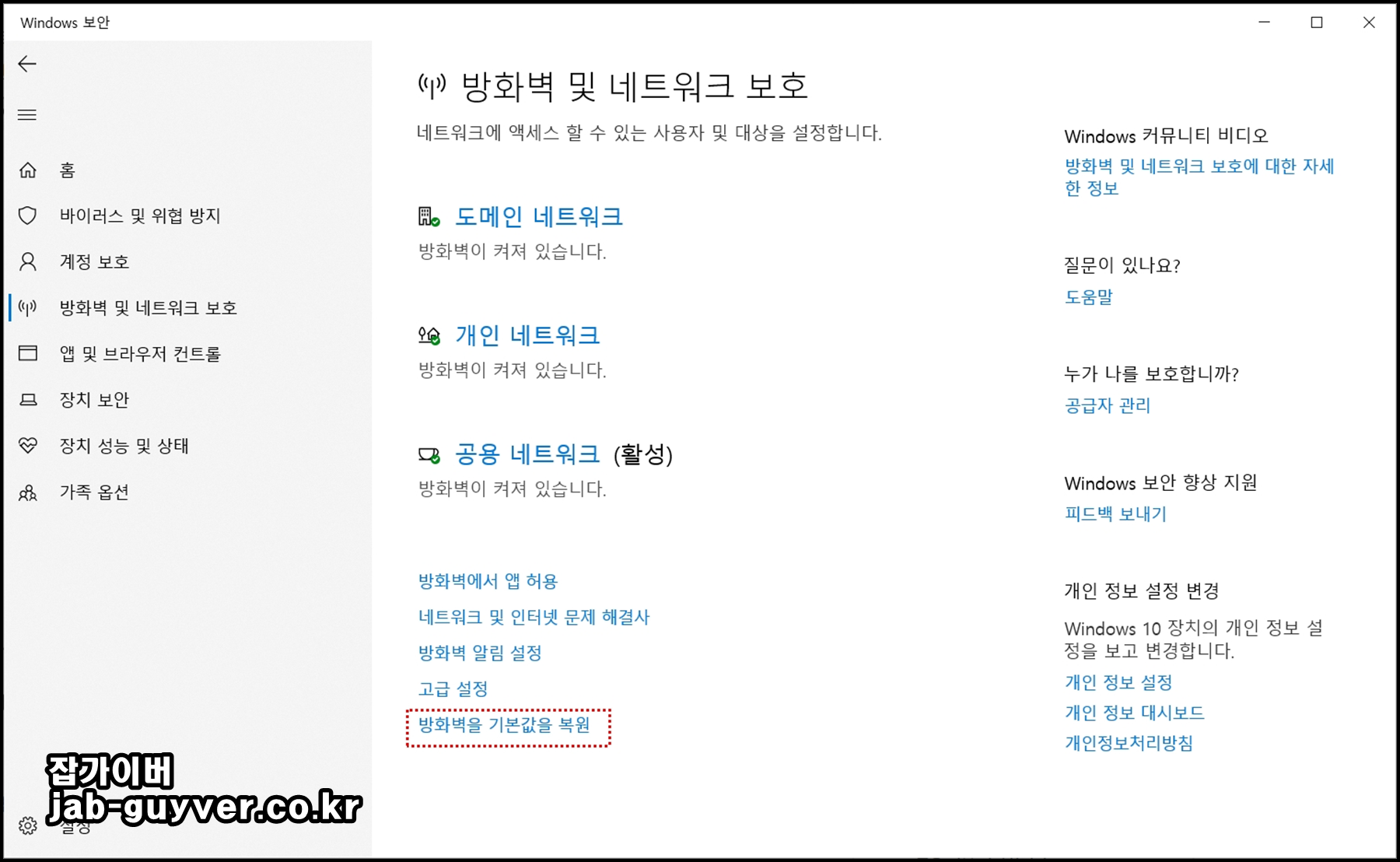 방화벽 및 네트워크 보호를 통해 기본값으로 복원합니다.