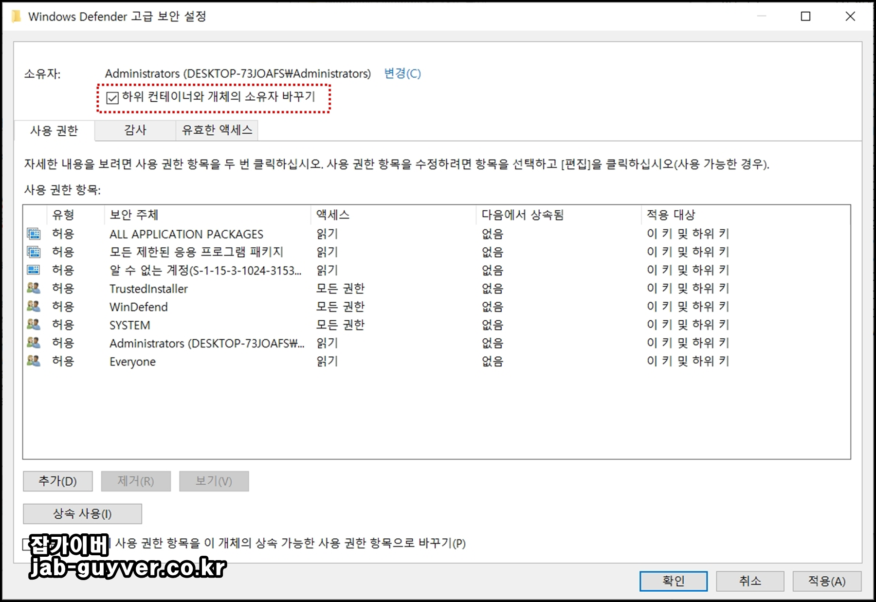 이후 해당 관리자권한에 대한 모든권한을 허용하도록 하는것으로 윈도우디펜더 기능에 대한 권한부여가 완료됩니다.