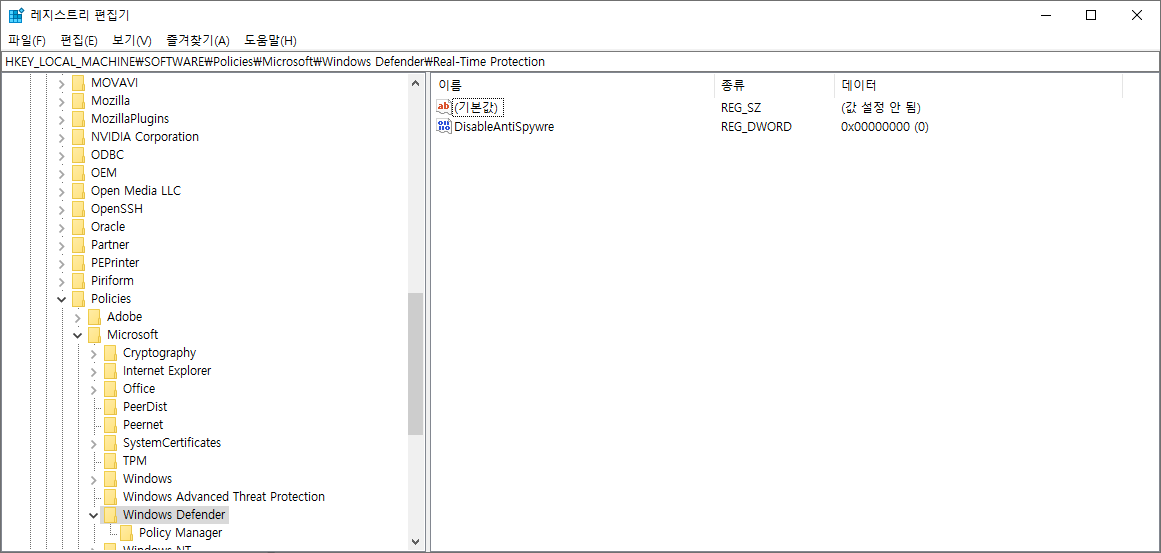 그럼 윈도우디펜더가 안켜지거나 실시간보호가 실행되지 않는것을 강제로 실행하도록 설정합니다.