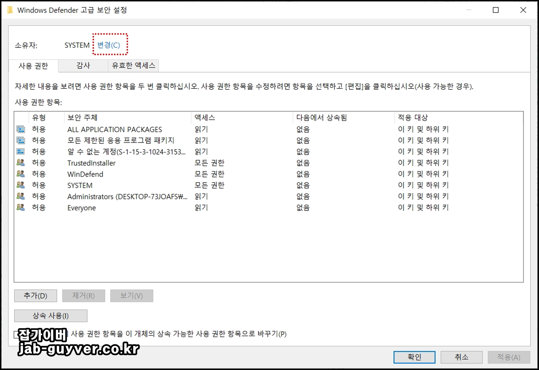 소유주가 시스템으로 되어 있으며 변경을 눌러줍니다.