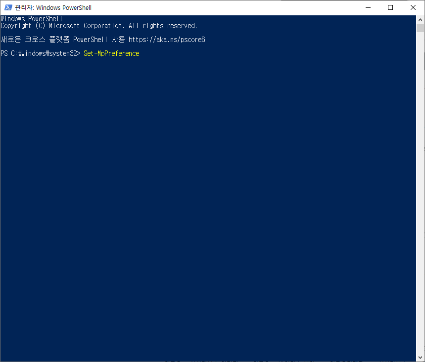 Set-MpPreference 명령어를 통해 실시간 보호, 샘플 전송, 클라우드 보호 등을 모두 자동으로 설정할 수 있습니다. 단, 이 명령어 사용은 관리자 권한이 필수입니다.