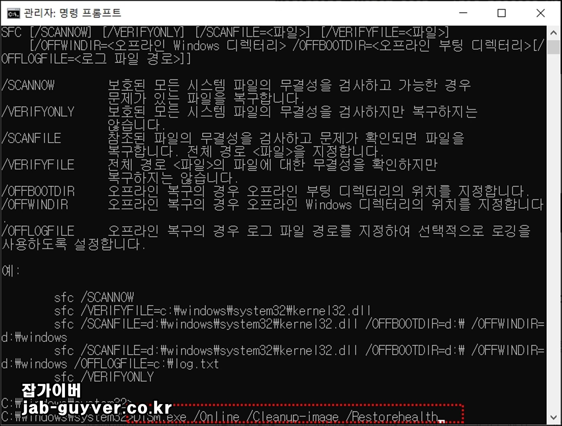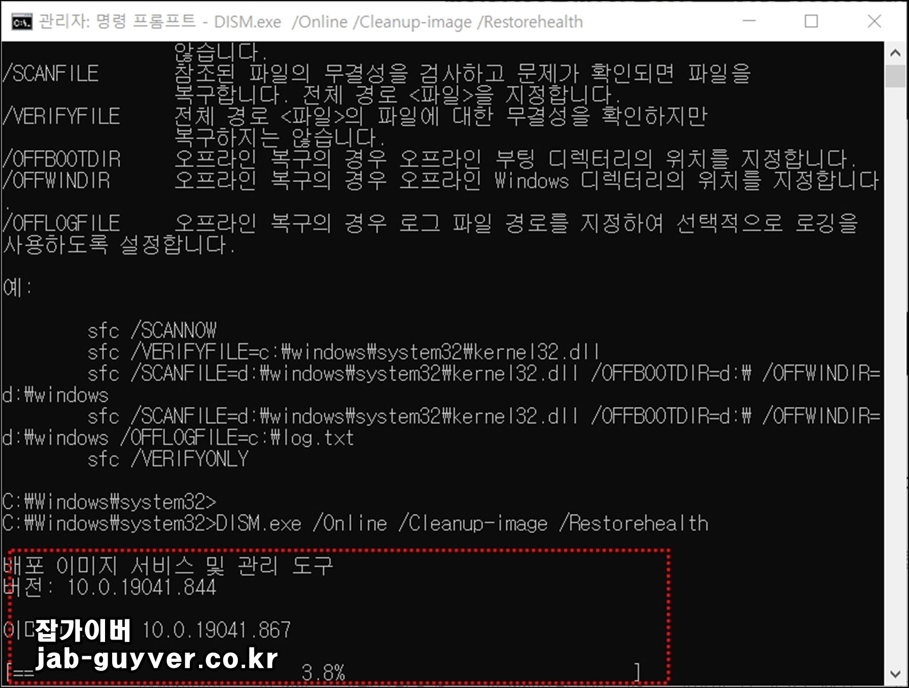 위 명령어를 입력하고 엔터를 누르면 시스템 파일 검사가 시작됩니다. 시간이 꽤 걸릴 수 있으며, 검사 결과에 따라 일부 손상된 파일이 자동으로 복구되기도 합니다.