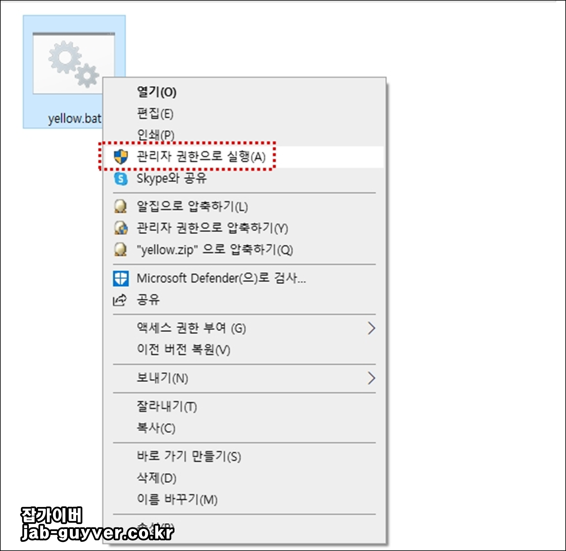 이제 다른 이름으로 저장을 눌러 파일 형식을 텍스트 문서(txt) → 모든 파일로 바꾸고, 파일 이름은 yellow.bat처럼 .bat 확장자로 저장합니다.