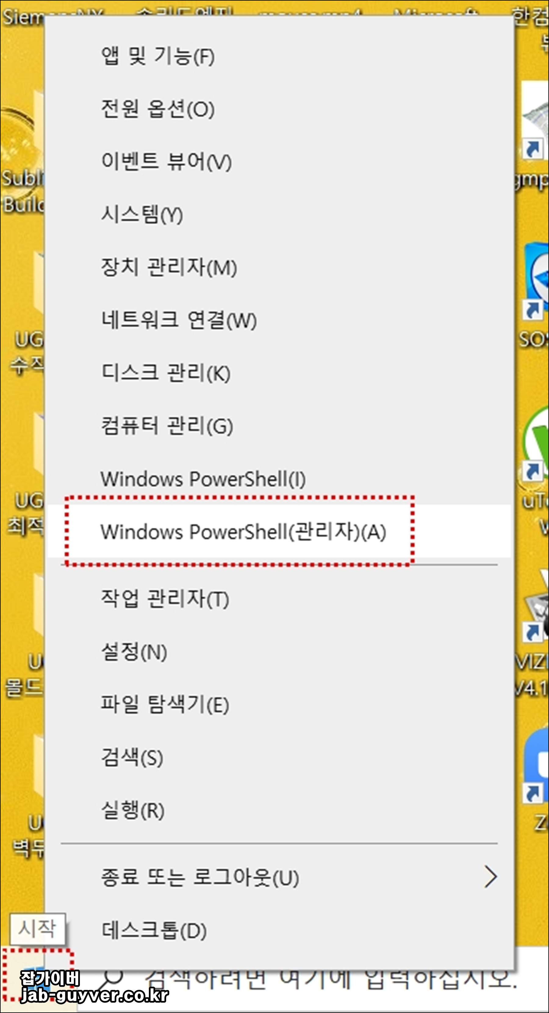 작업 표시줄의 윈도우 로고를 마우스 오른쪽 버튼으로 클릭해 Windows PowerShell(관리자)를 선택합니다.
