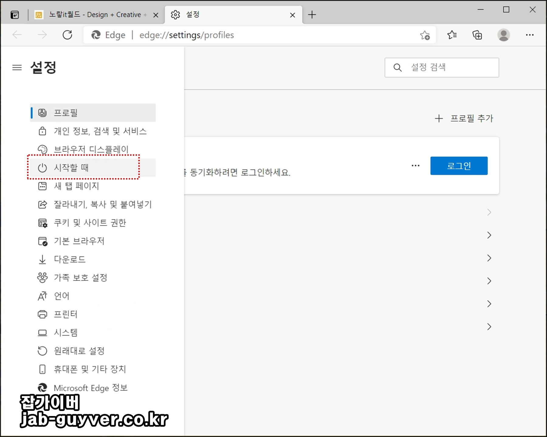좌측 설정탭을 눌러 시작할 때로 들어갑니다.