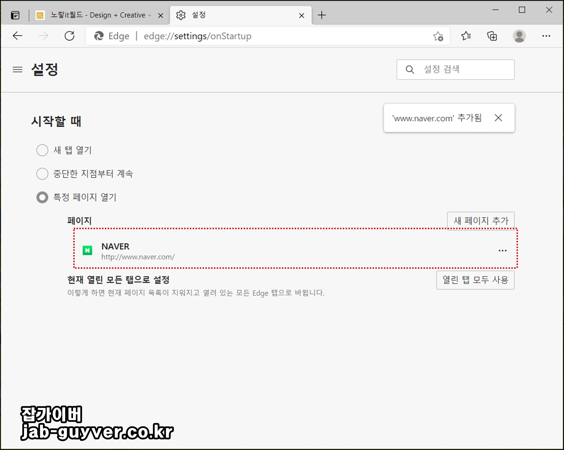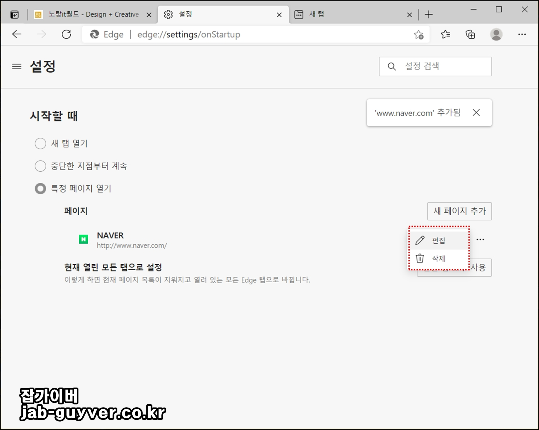 이렇게 설정된 인터넷 시작페이지는 나중에 삭제하거나 주소를 변경이 가능합니다.