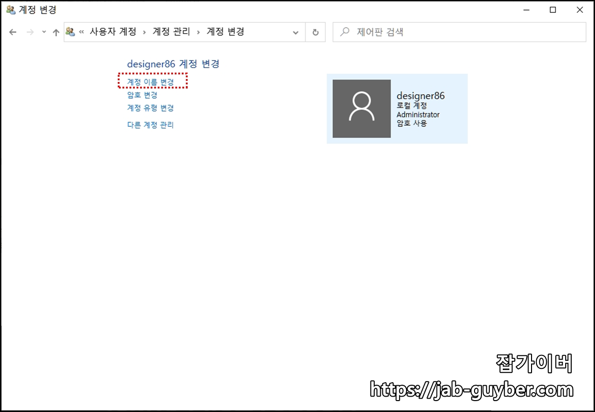 - 제어판 - 사용자 계정 유형 변경 - 계정 이름 변경으로 영문 이름으로 변경합니다.