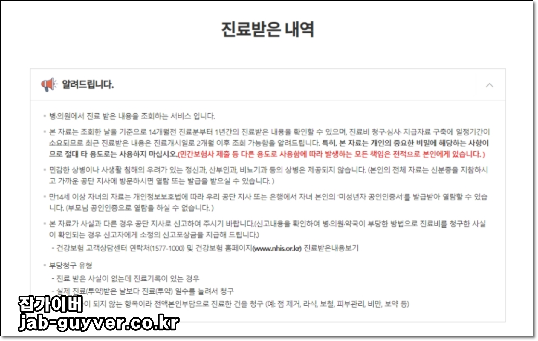 ※ 청구되지 않은 진료받은 내용은 해당 병, 의원 및 약국에서 진료비 청구가 있을 경우 회원에게 제공됩니다.