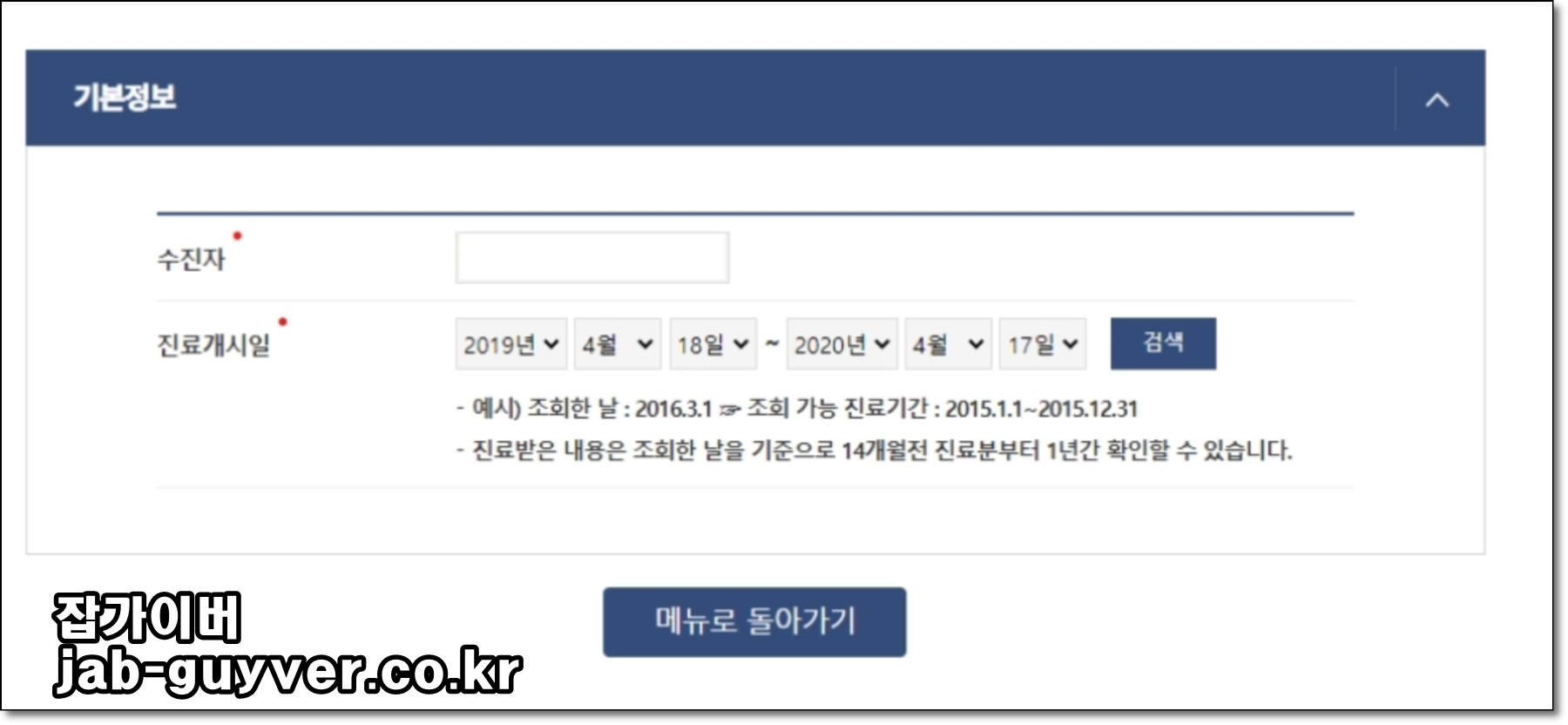 수신자와 진료개시일을 선택할 수 있으며 병원 방문일에 대하여 조회 날짜는 14개월 전 진료분부터 1년간 확인이 가능하며 병원 진단 내역을 조회 후에 자료가 사실과 다른 경우에는 공단 지사로 신고를 해야 합니다.
