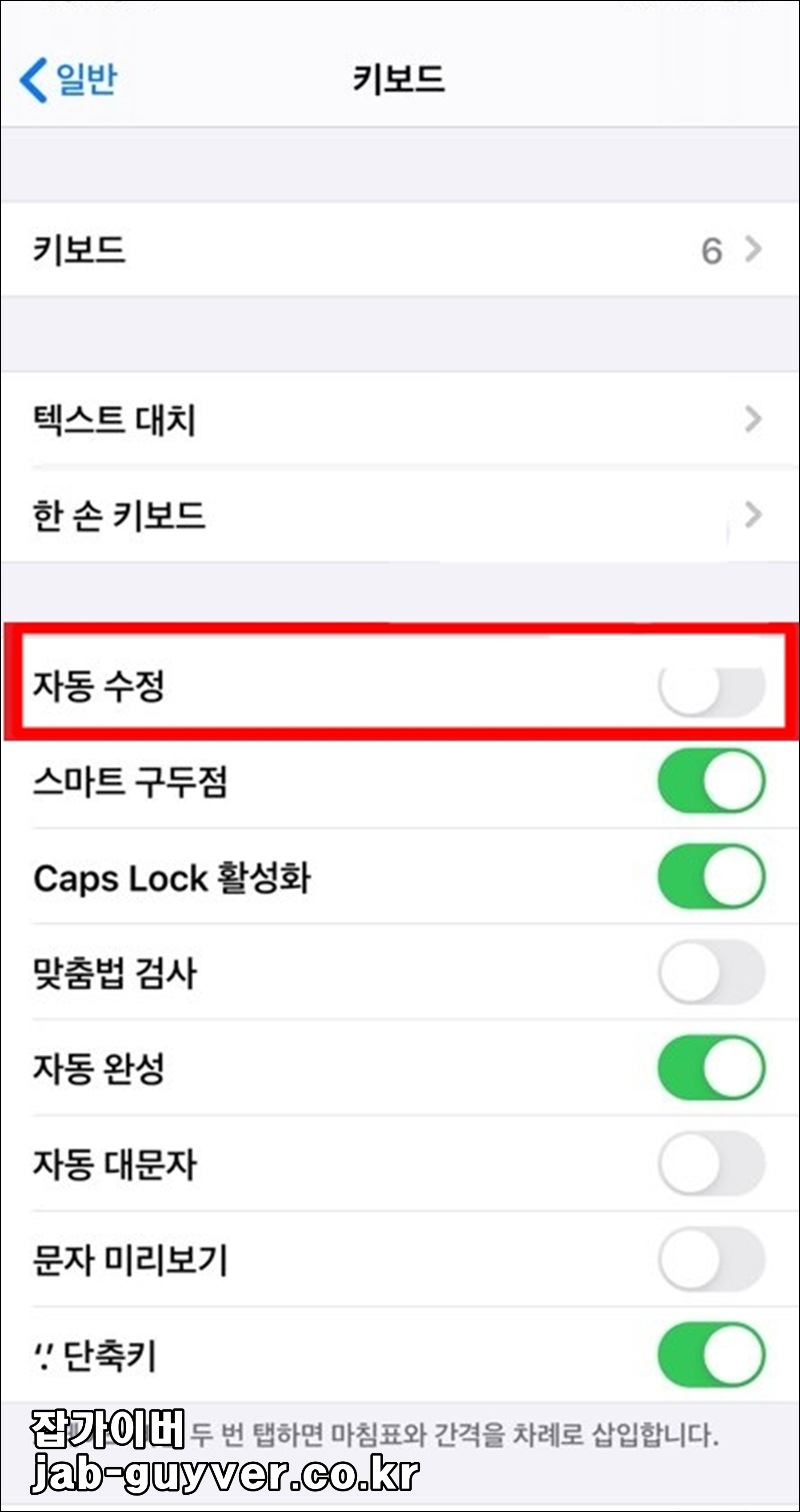 아이포 텍스트 대치 설정이 완료되었다면 키보드 탭으로 돌아가셔서 자동 수정 탭이 있는데 기본적으로 비활성화로 되어있는 부분을 스페이스바를 눌러야 적용이 됩니다.