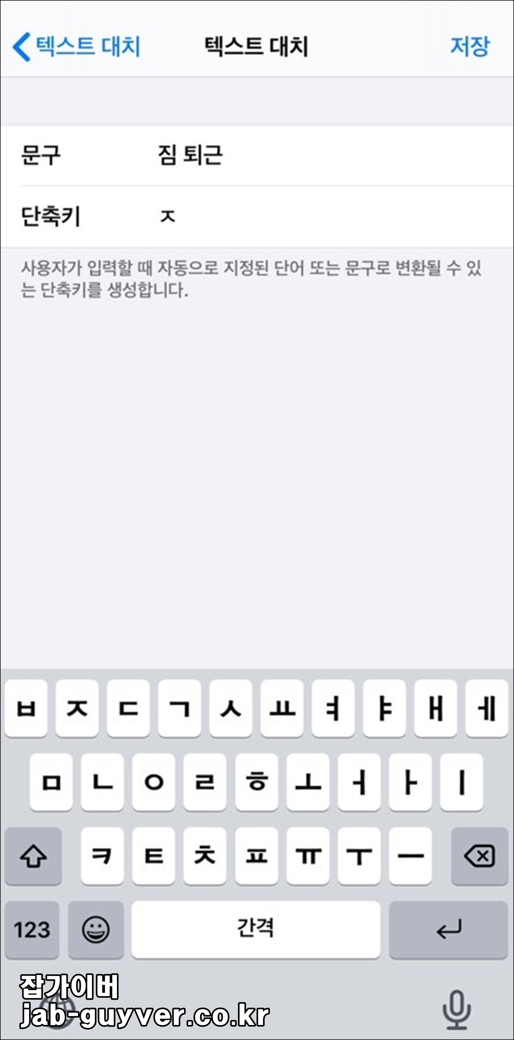 ㅈ키를 누르면 짐 퇴근이 쳐지도록 되어 있으며 ㅈㄱㅈ이라고 타이핑을 치면 지금 가는 중!이라고 텍스트 대치 설정이 되어 있습니다.