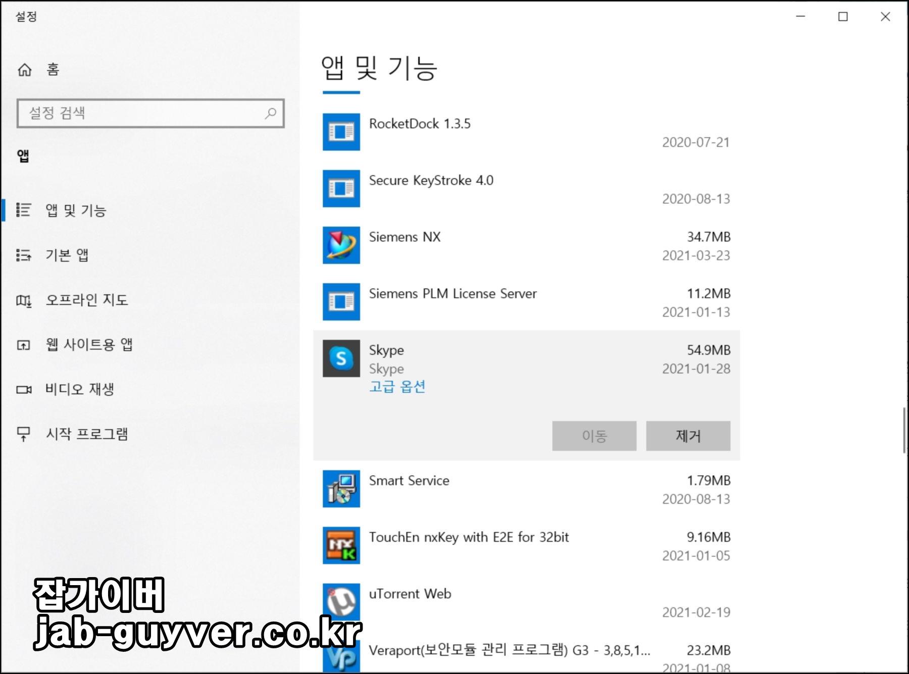 앱 및 기능에서 Skype를 찾아 제거버튼을 눌러 삭제가 가능합니다.