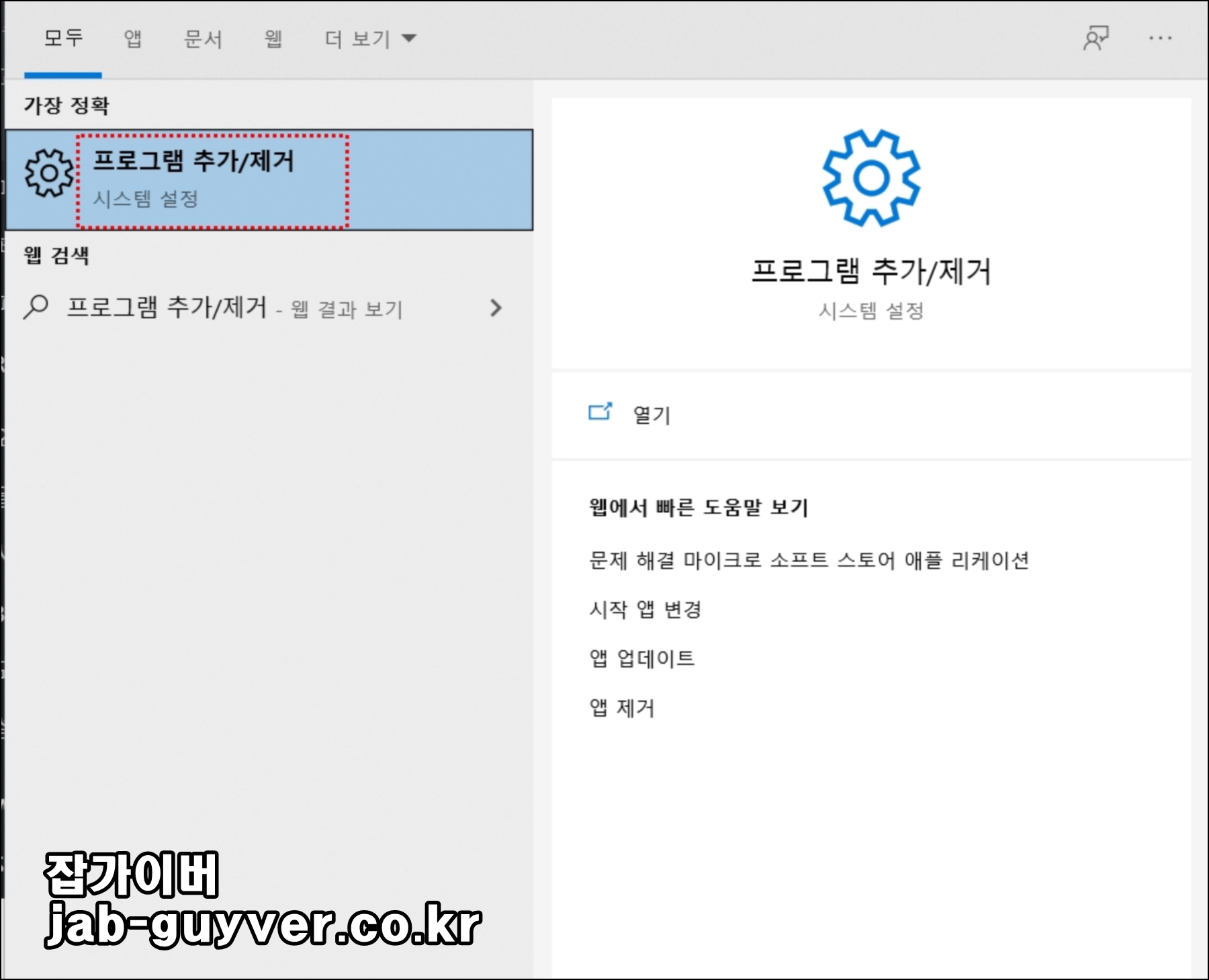 윈도우10 기준 좌측하단 검색창에 프로그램 추가/제거를 검색해서 실행합니다.