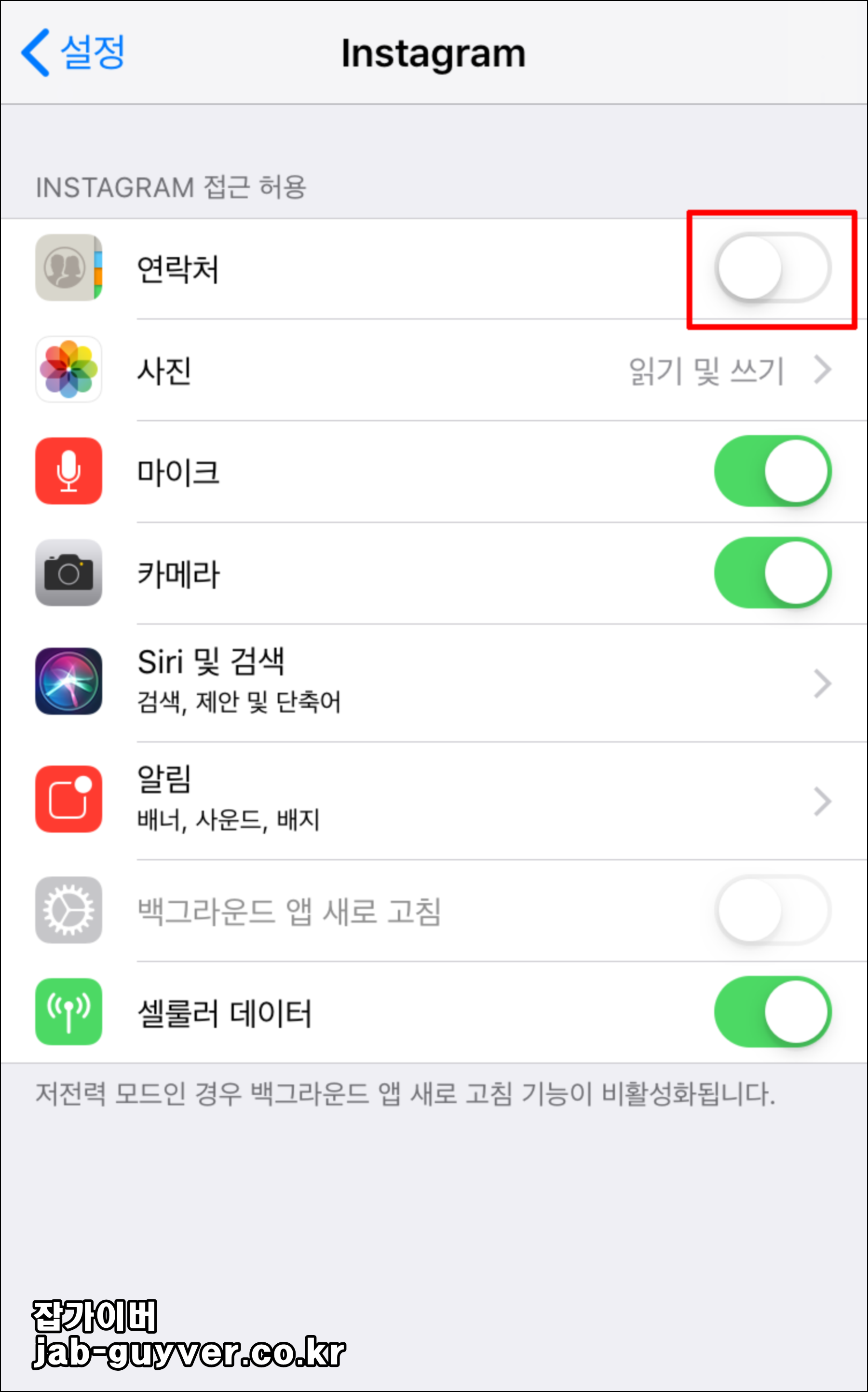 설정 → Instagram → 연락처 → 비허용