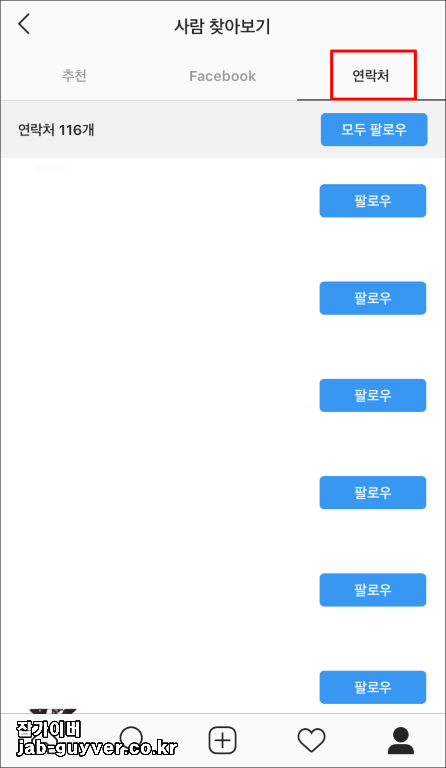 연락처 화면에서는 내 번호에 저장된 인스타 사용자 계정이 추천으로 뜨고, 팔로우 버튼이 바로 보이기도 합니다.