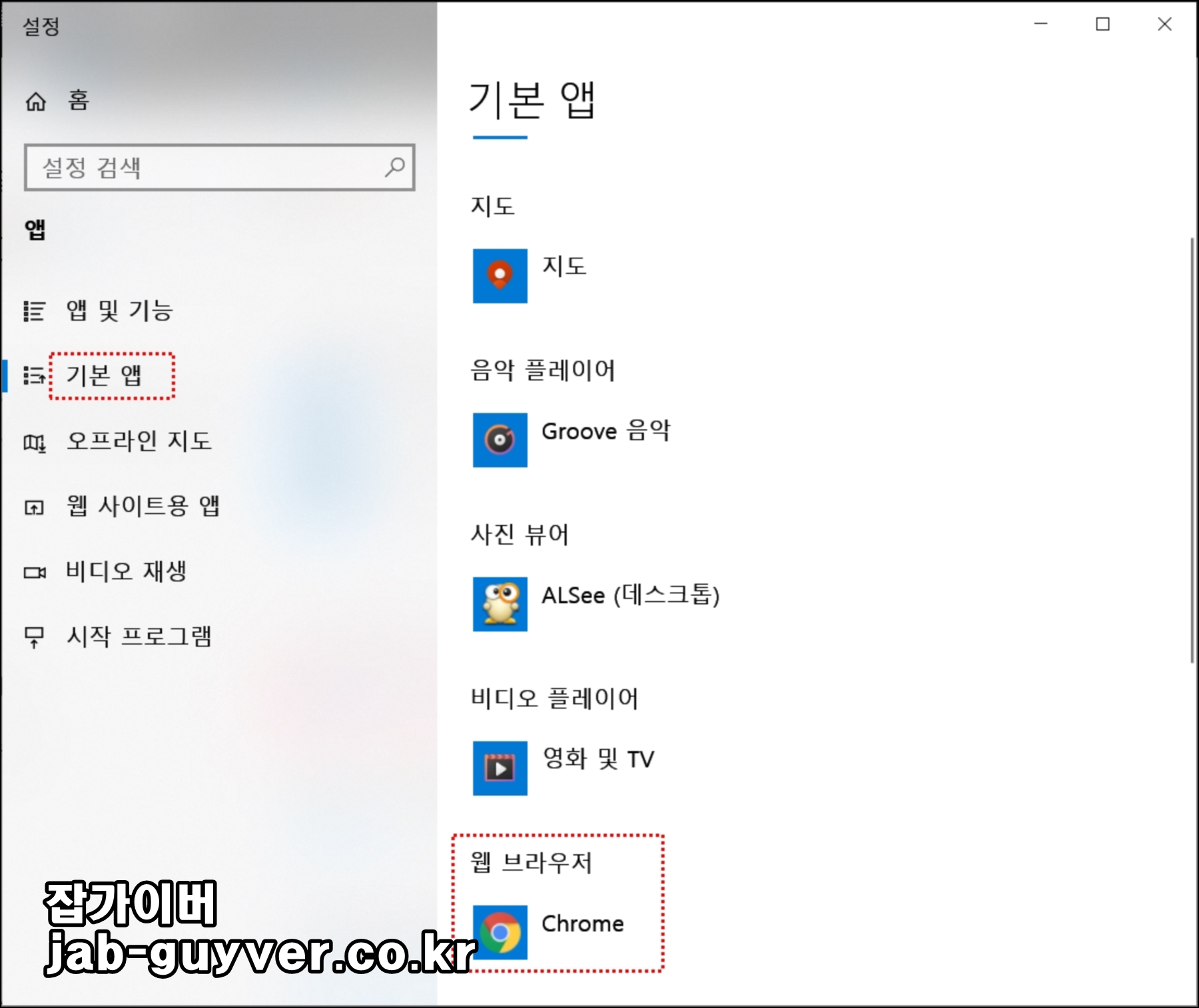 웹 브라우저로 사용할 기본 인터넷 앱을 선택합니다.
