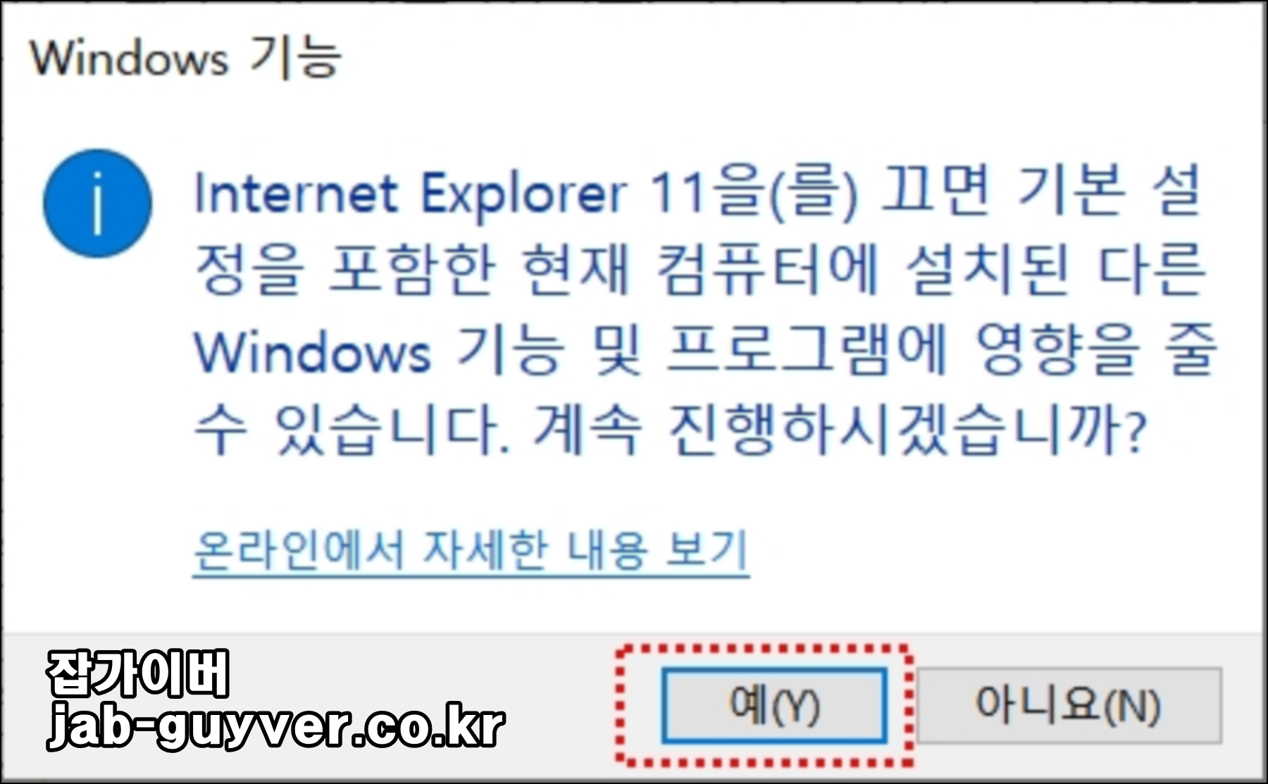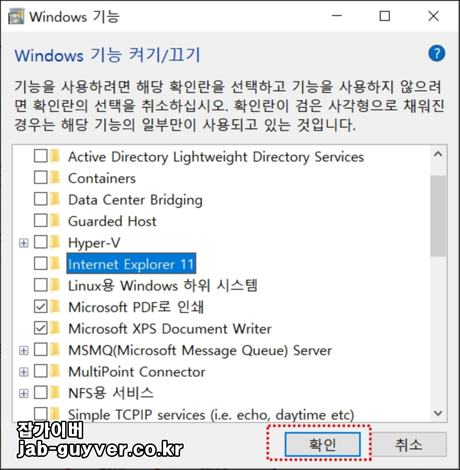 Internet Explorer 11을 찾아 체크를 해제하고 확인을 눌러줍니다.