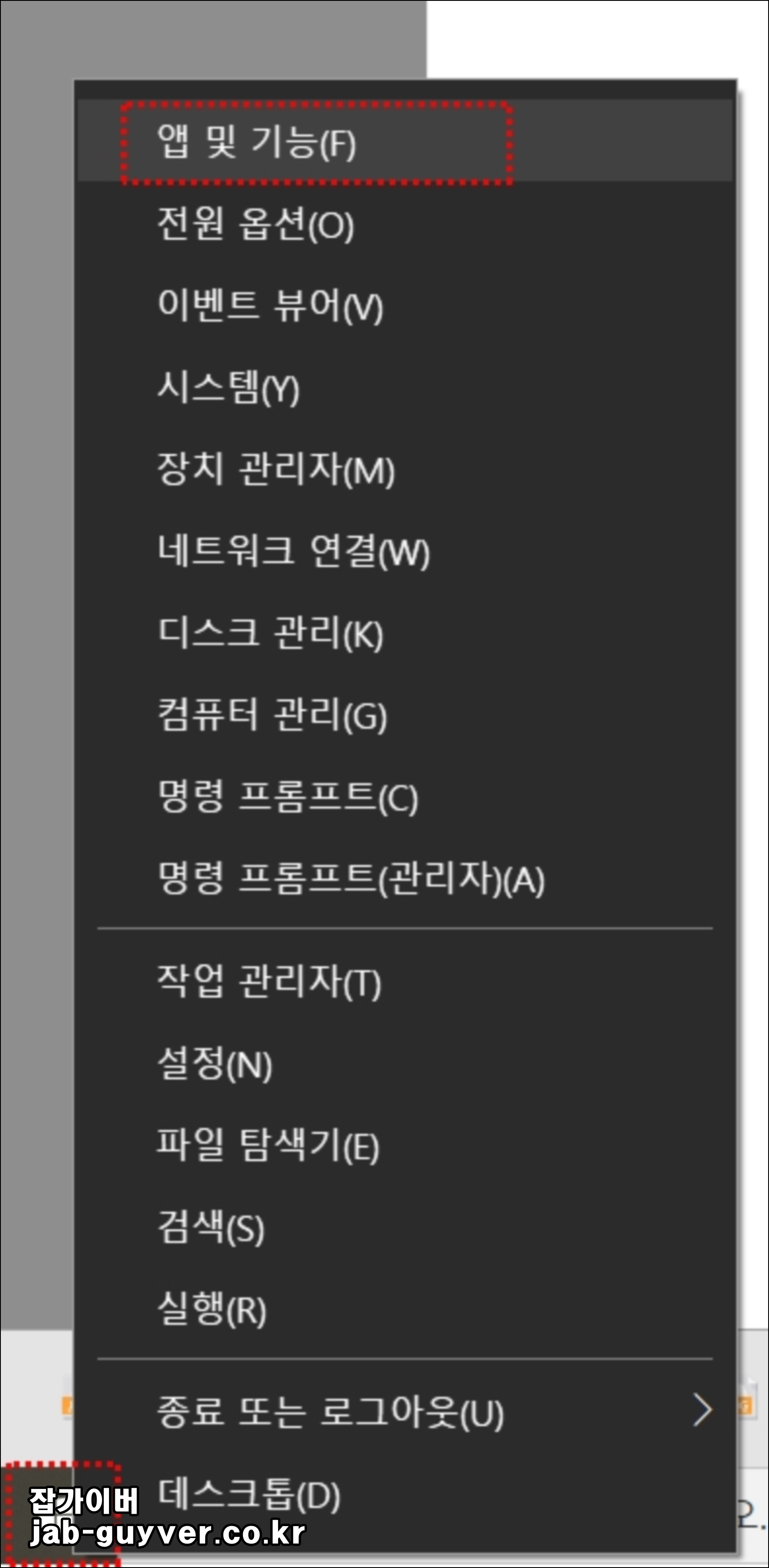 윈도우 로고 마우스 우클릭 "앱 및 기능"을 선택합니다.