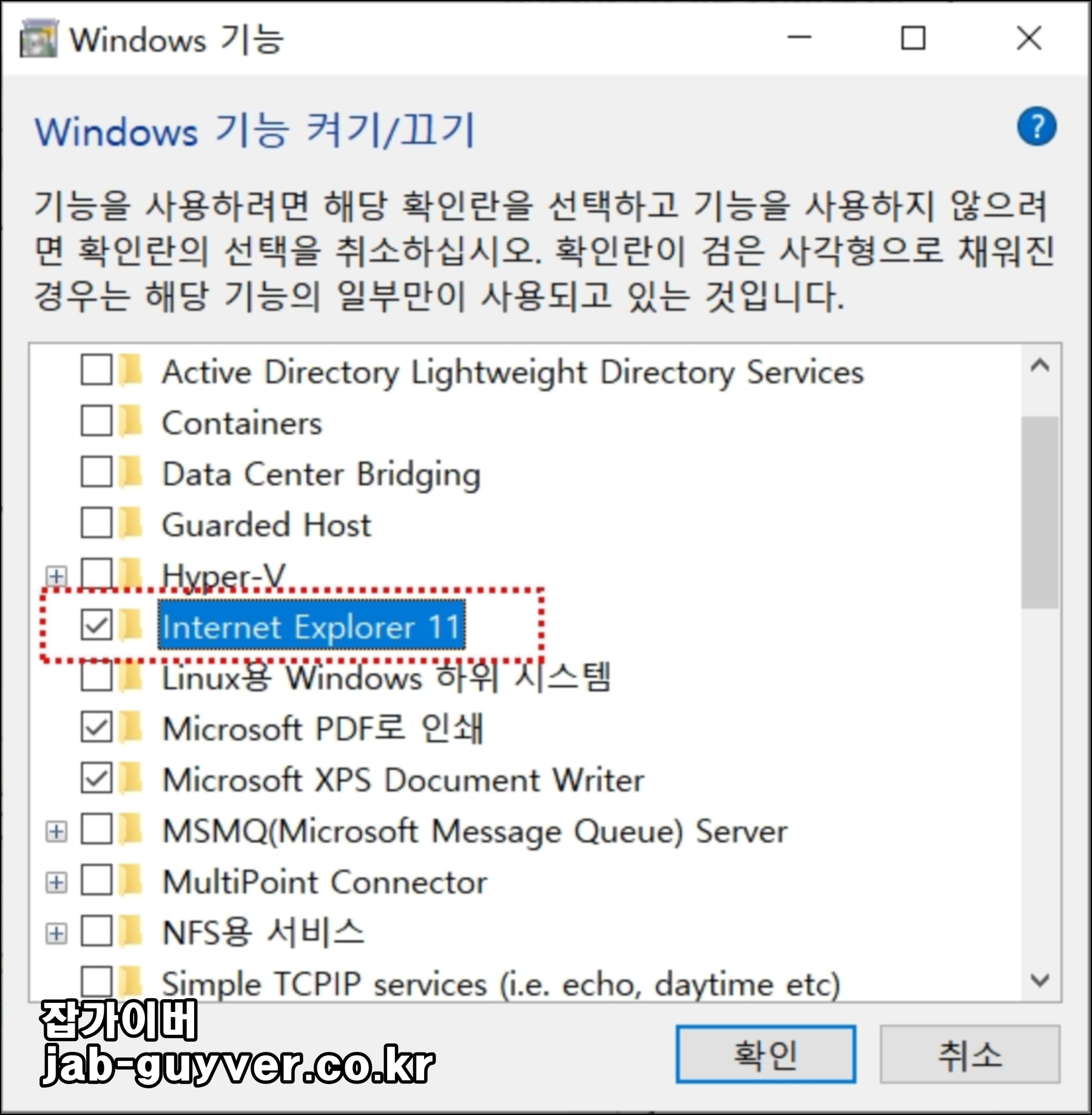 Internet Explorer 11을 찾아 체크를 해제하고 확인을 눌러줍니다.