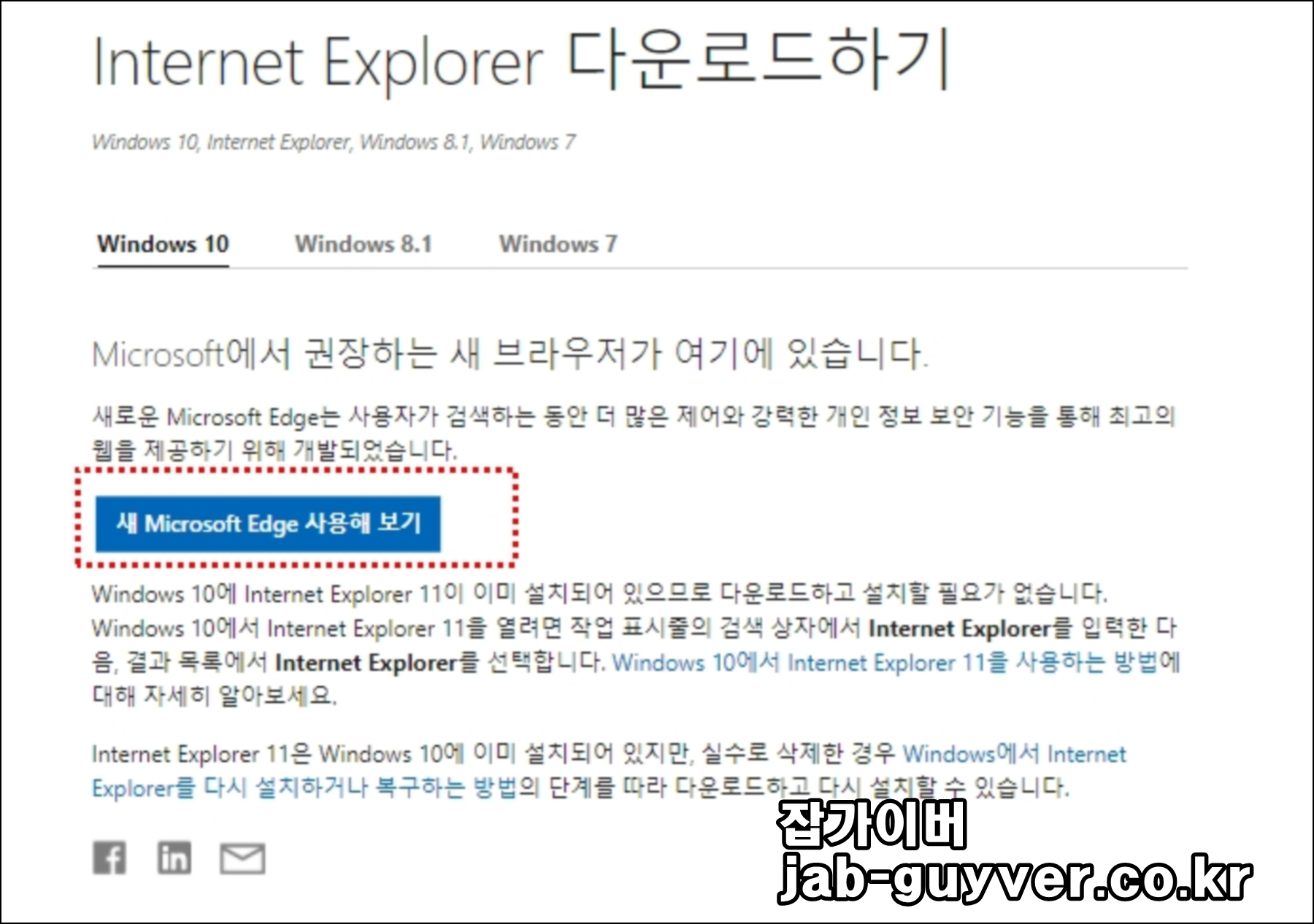 기본적으로 인터넷 익스플로러 다운로드를 위해서는 윈도우10,윋노우8.1,윈도우7 3가지 운영체제의 버전을 제공합니다.