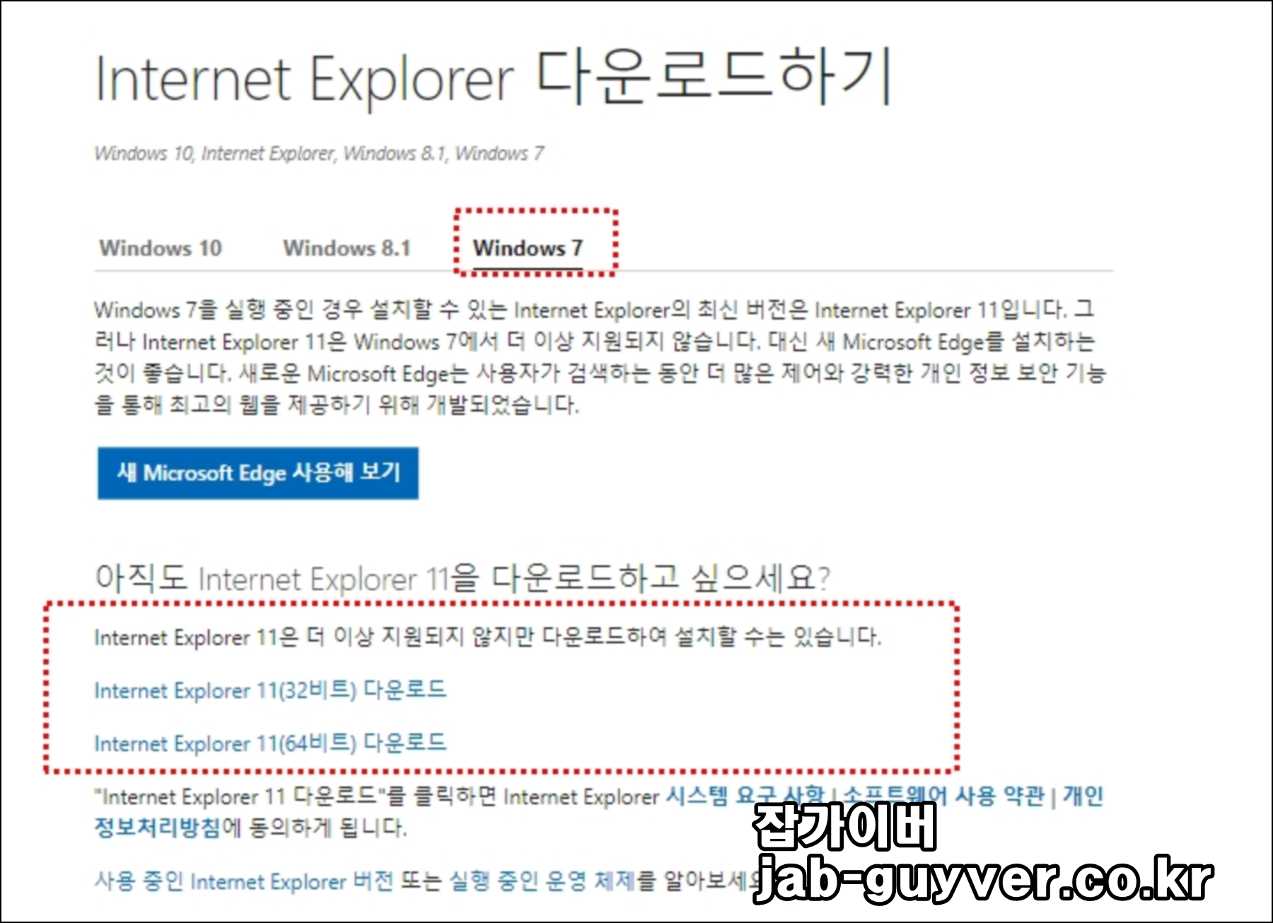 그래도 설치를 원하는 분들은 Winodws7 탭으로 이동하면 인터넷 익스플로러 32비트 버전과 64비트 버전으로 다운로드 받아 설치가 가능합니다.