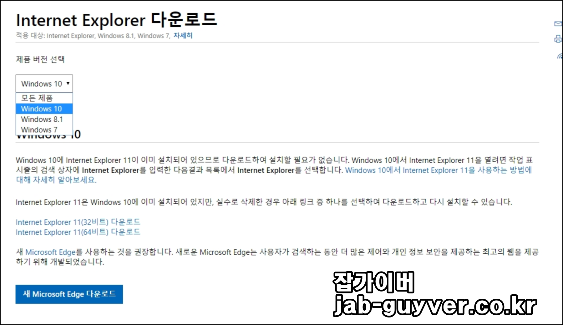 기본적으로 인터넷 익스플로러 다운로드를 위해서는 윈도우10,윋노우8.1,윈도우7 3가지 운영체제의 버전을 제공합니다.