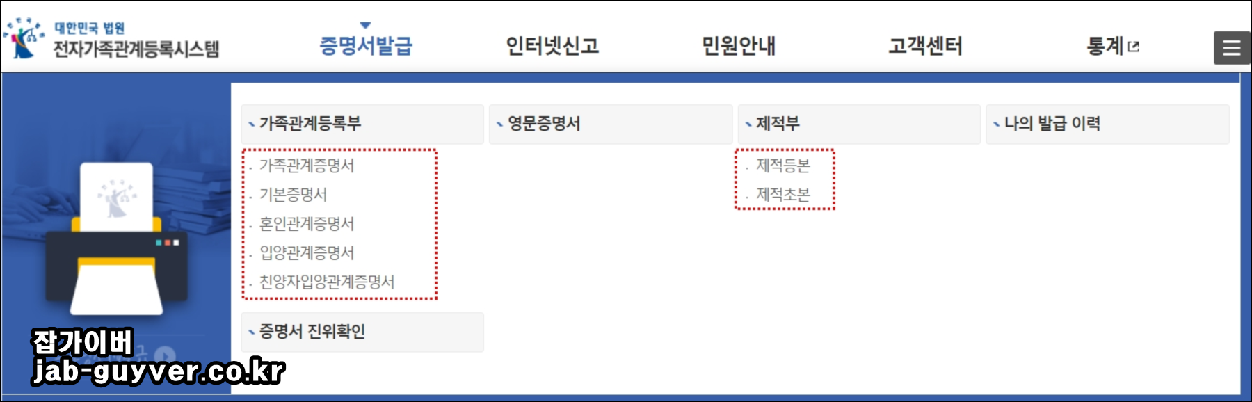 기본적으로 가족관계 등록부에서 제공하는 5가지 증명서를 발급할 수 있습니다.