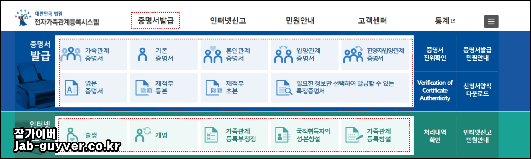 기본적으로 가족관계 등록부에서 제공하는 5가지 증명서를 발급할 수 있습니다.