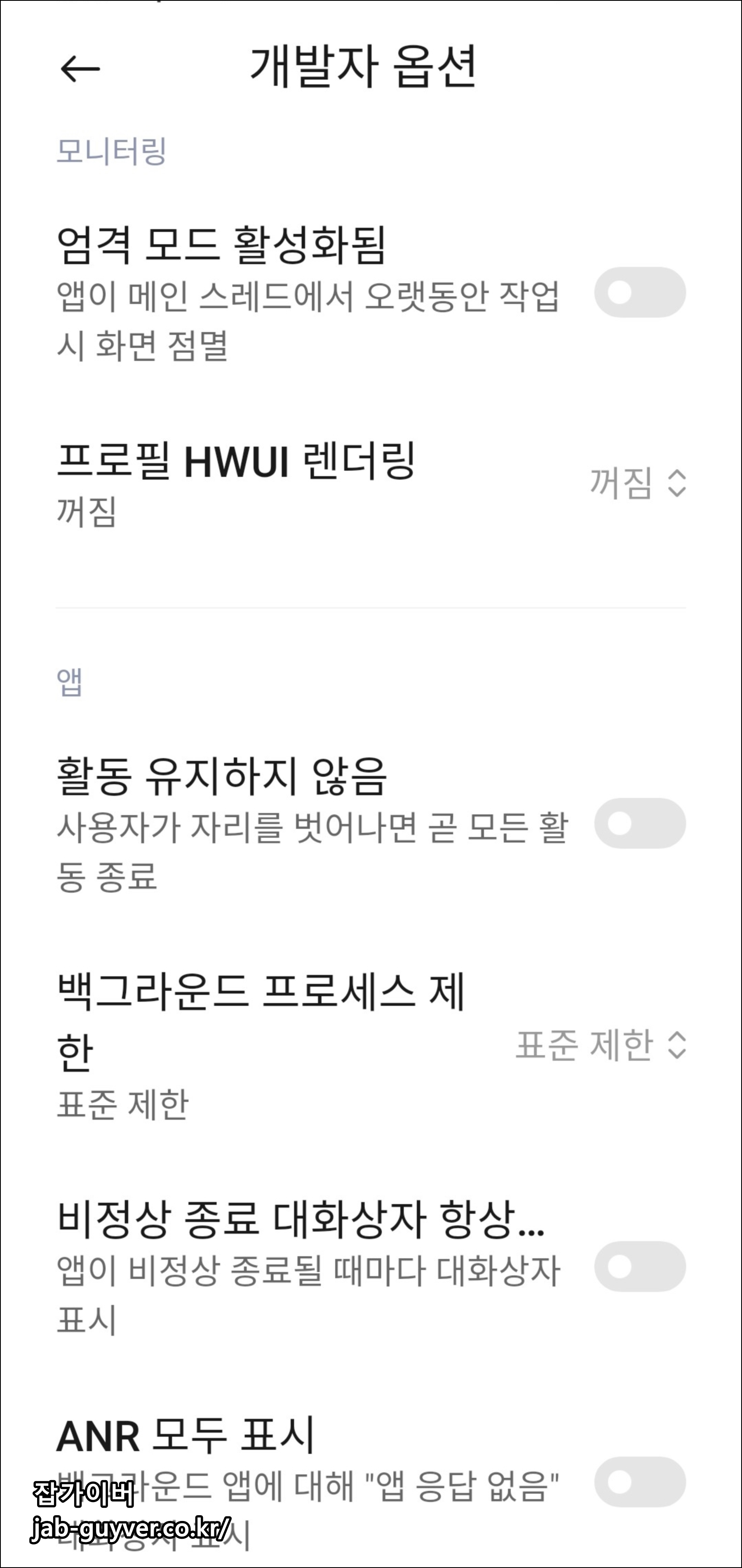 일부 사용자에게는 앱 알림 누락, 자동실행 제한 등의 불편을 줄 수 있으므로, 개발자 설정에서 해당 기능을 꺼서 사용하는 것이 더 유연한 사용자 경험을 제공할 수 있습니다.