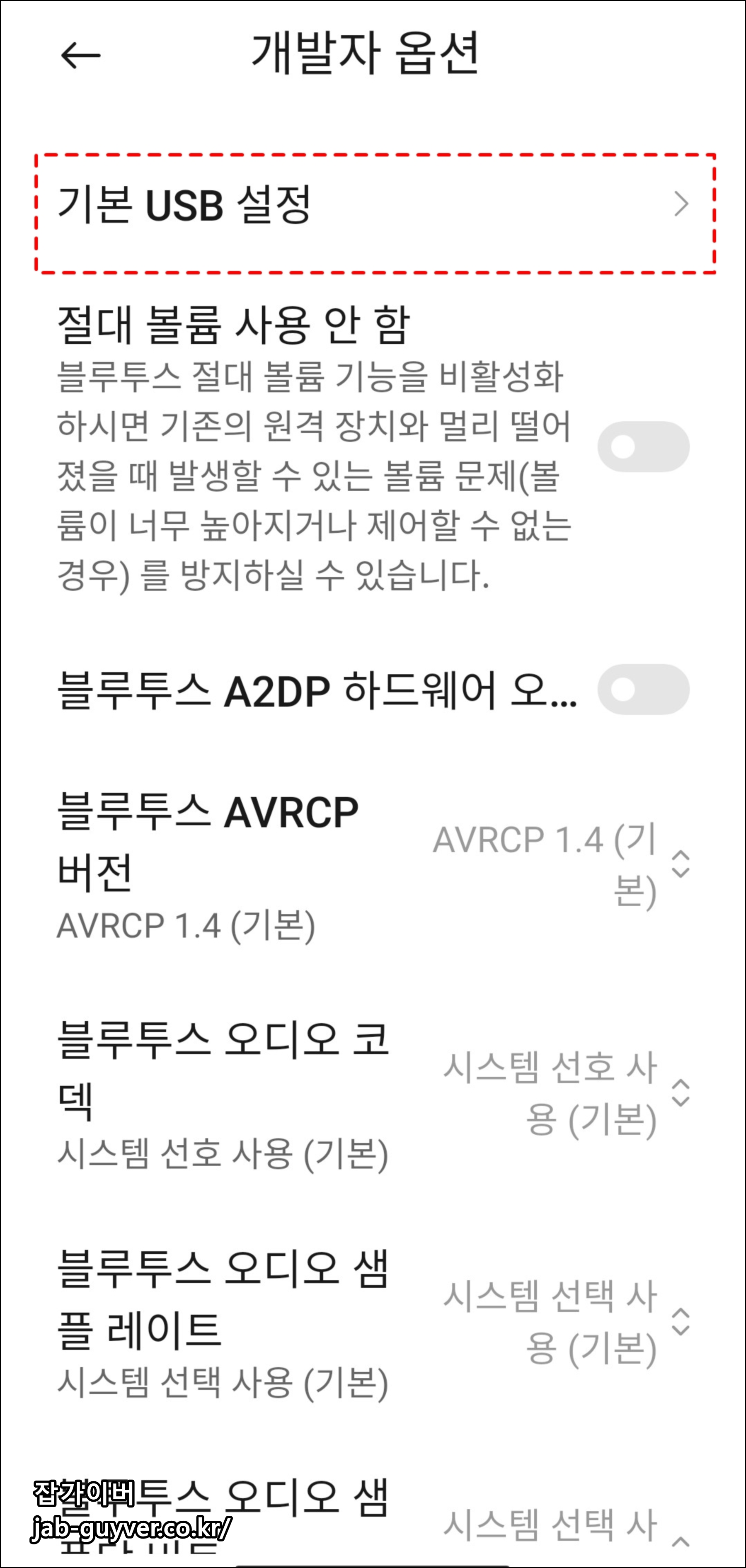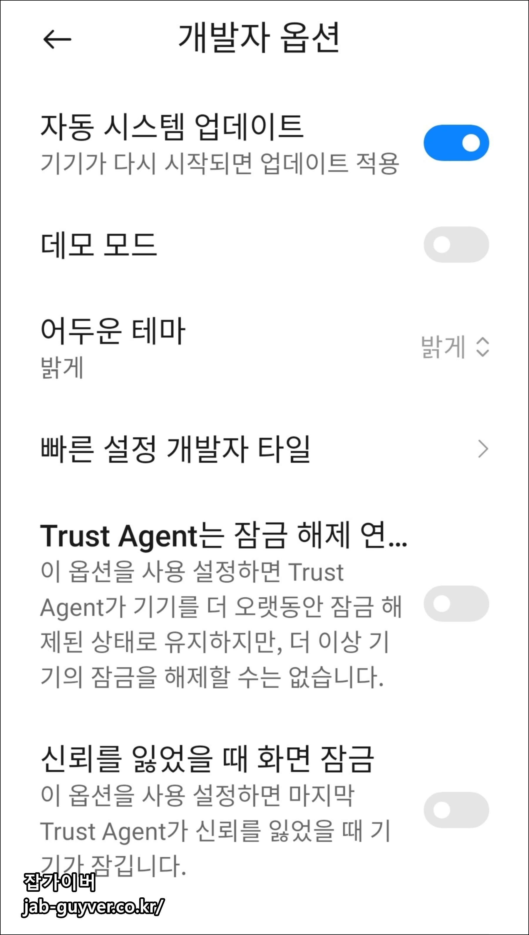 시스템 업데이트 후 일부 개발자 옵션이 기본값으로 초기화될 수 있습니다.