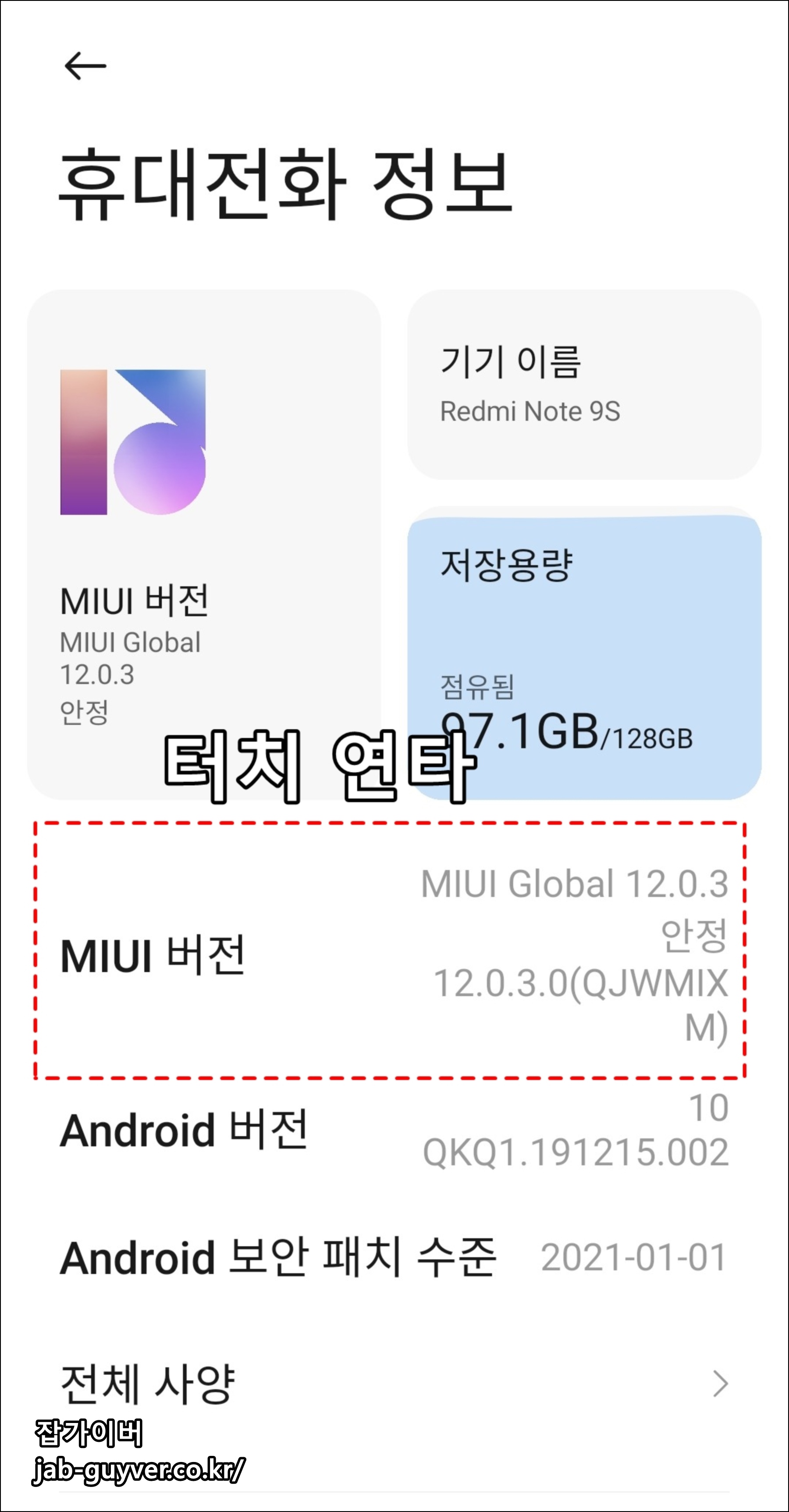 이후 휴대전화 정보로 들어가면 현재 사용 중인 miui 버전과 안드로이드 버전을 확인할 수 있습니다.
