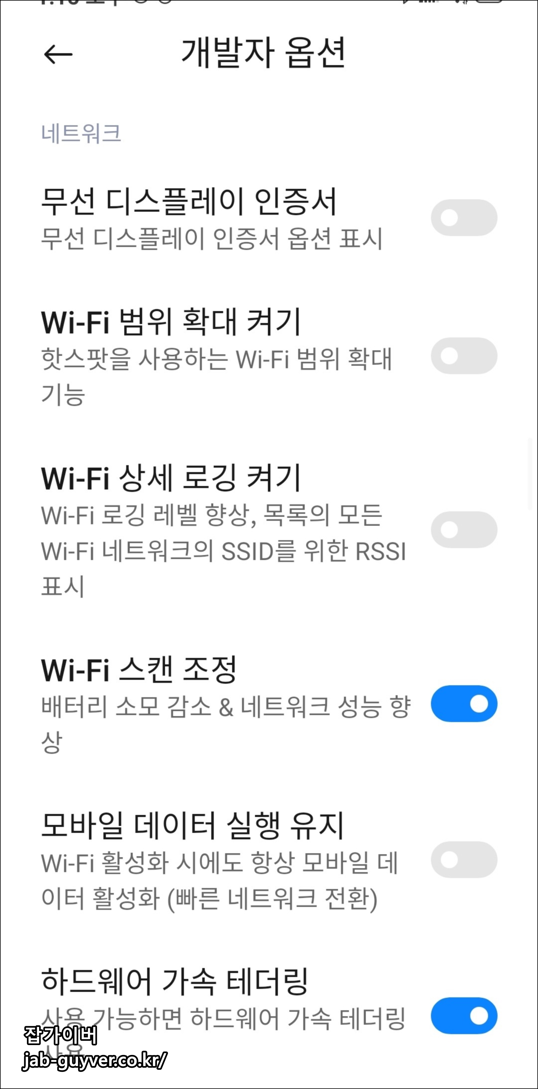 일부 샤오미 기종이나 MIUI 버전에서는 보안 정책으로 인해 개발자 옵션 내 설정이 재부팅 시 초기화될 수 있습니다.