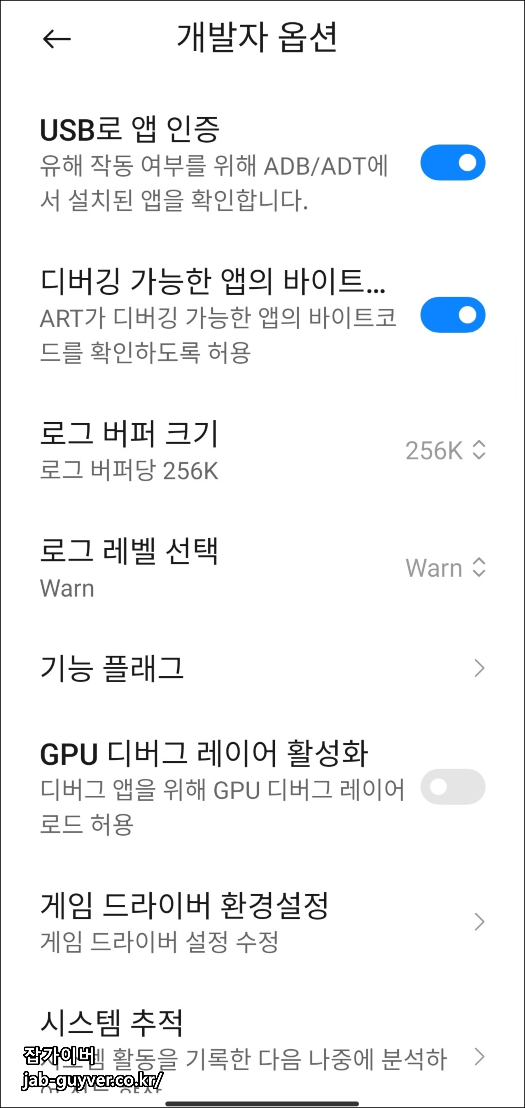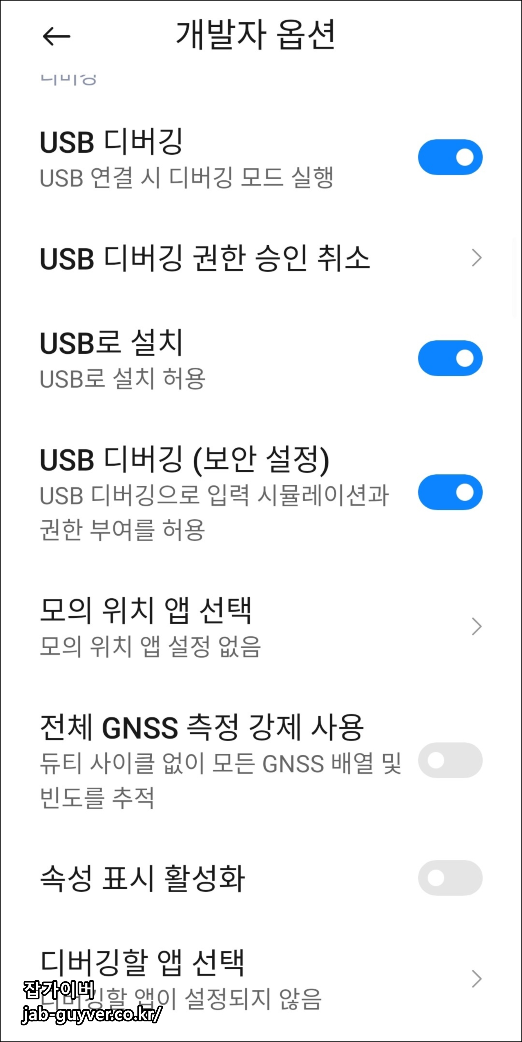 시스템 업데이트 후 일부 개발자 옵션이 기본값으로 초기화될 수 있습니다.