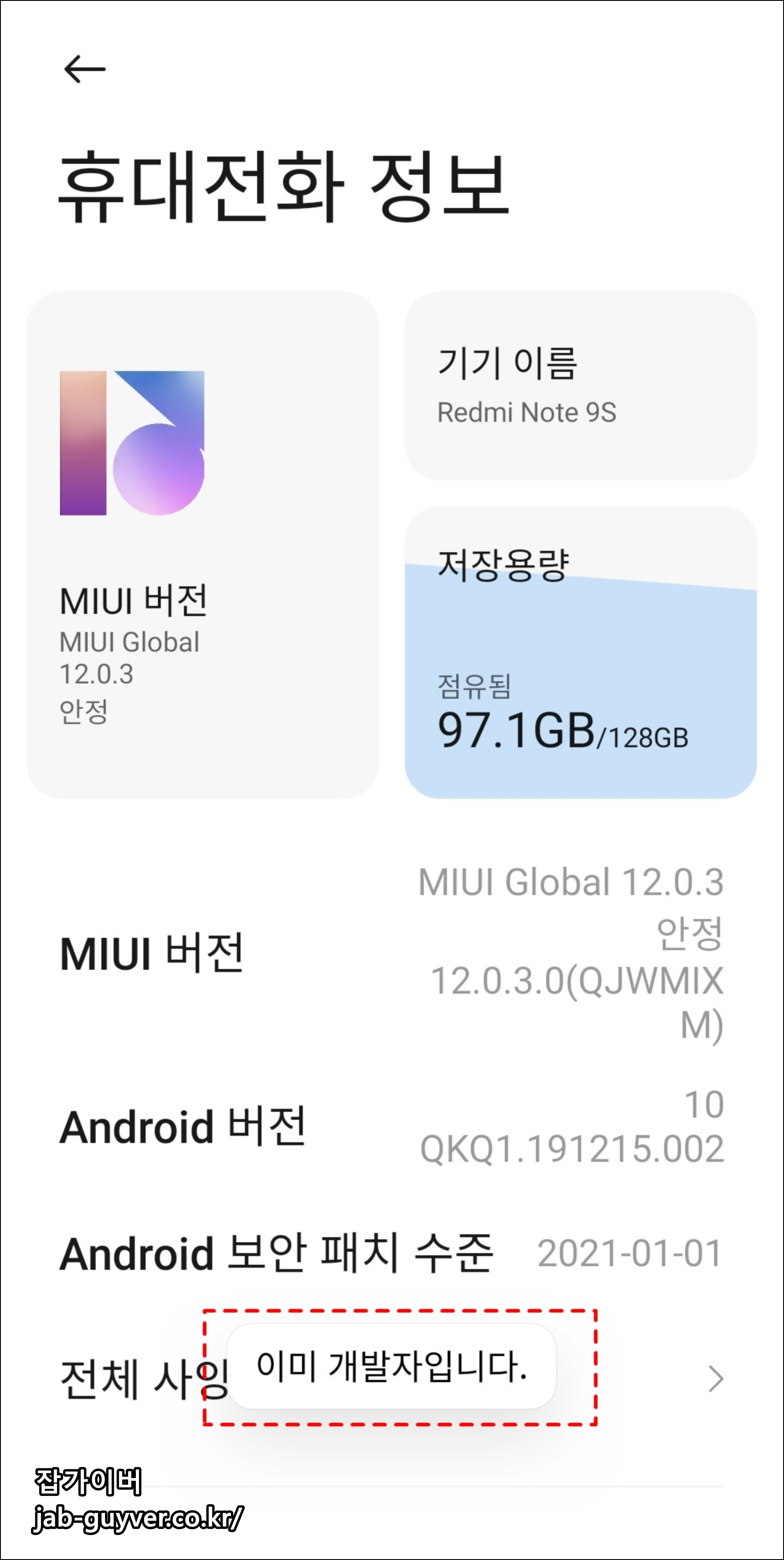 이후 휴대전화 정보로 들어가면 현재 사용 중인 miui 버전과 안드로이드 버전을 확인할 수 있습니다.