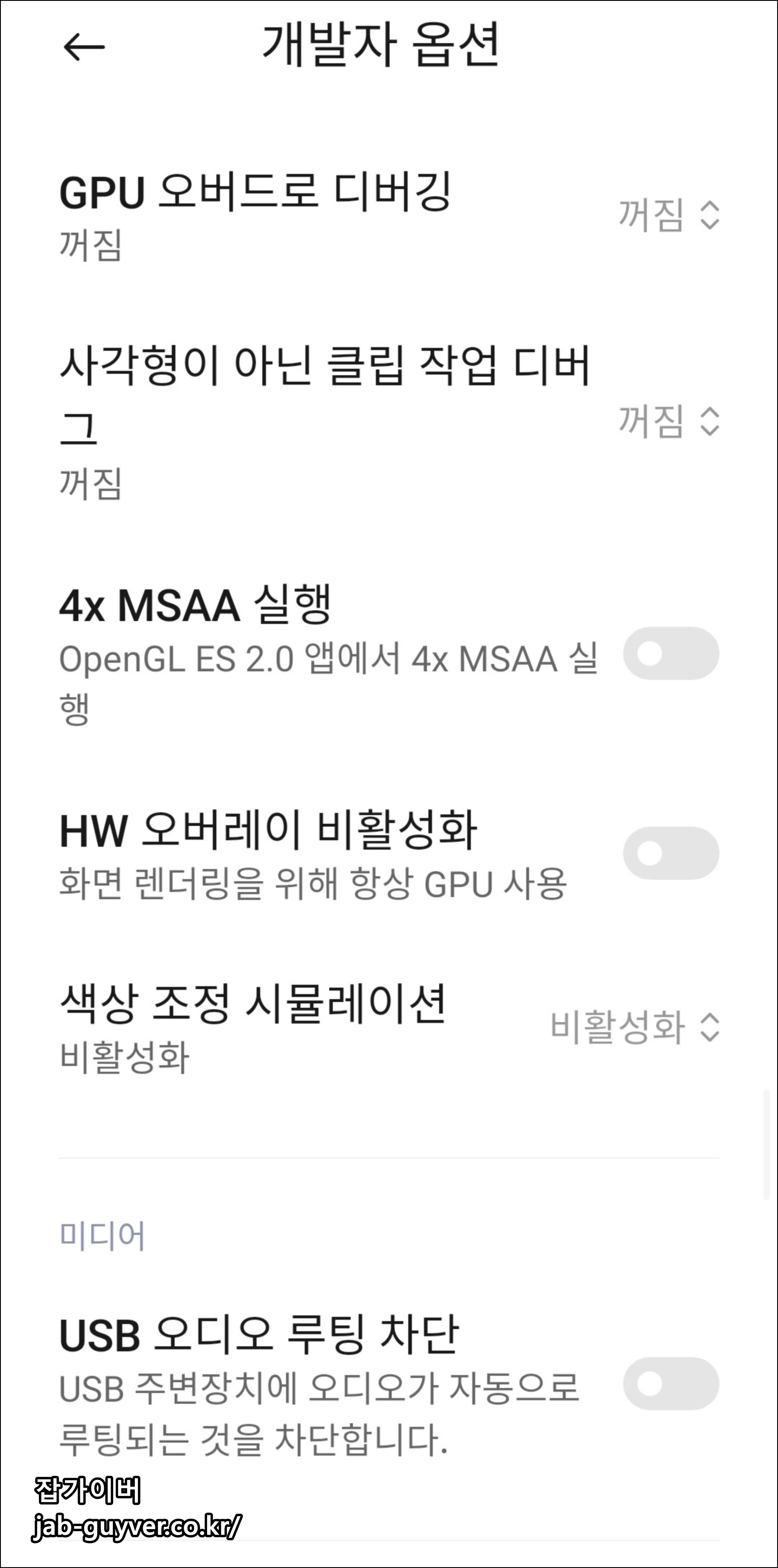 일부 샤오미 기종이나 MIUI 버전에서는 보안 정책으로 인해 개발자 옵션 내 설정이 재부팅 시 초기화될 수 있습니다.